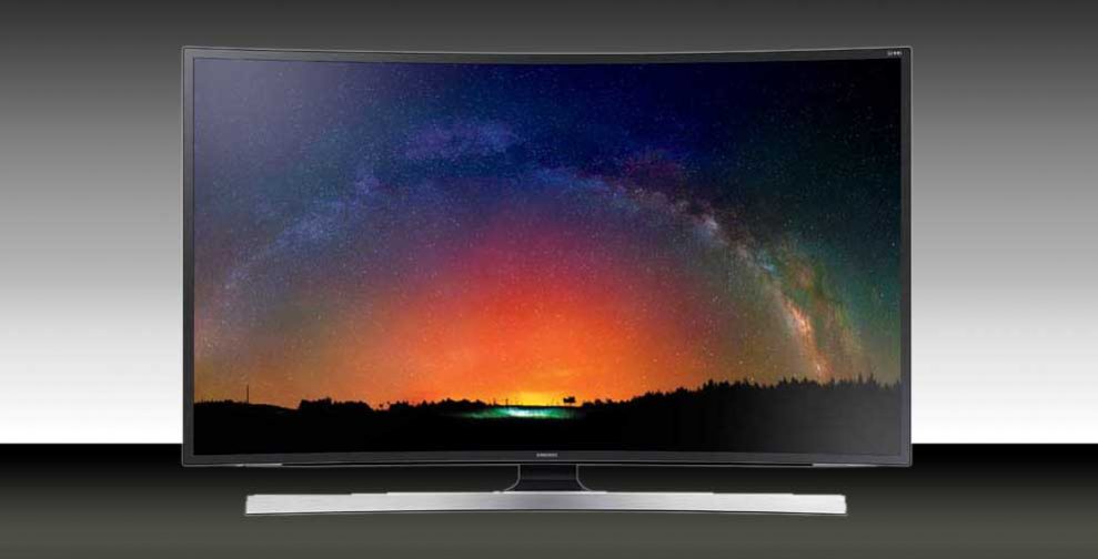 55JS8505 har en välvd design och en smal, mörkgrå ram och en stilig, mittmonterad sockel. Den blanka skärmytan präglas dock av lite spegelbilder, som blir konkava på grund av just den böjda formen.