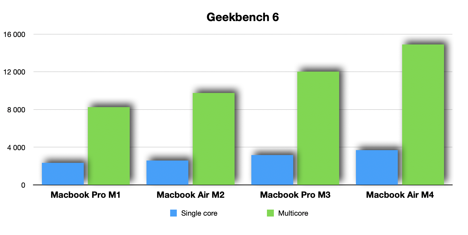 Apple gillar att dänga till med siffor som att senaste modellen är 10 eller till och med 20 gånger snabbare än tidigare modeller. Men då ska man vara medveten om att det jämförs med den fem år gamla Intel-modellen av MacBook Air. Inte särskilt relevant. De flesta som går och funderar på att uppgradera köpte nog M1-modellen när den stora uppgraderingen med Apples egna systemkretsar kom. Och visst är M4 mycket snabbare än den, men siffrorna är inte lika galna.