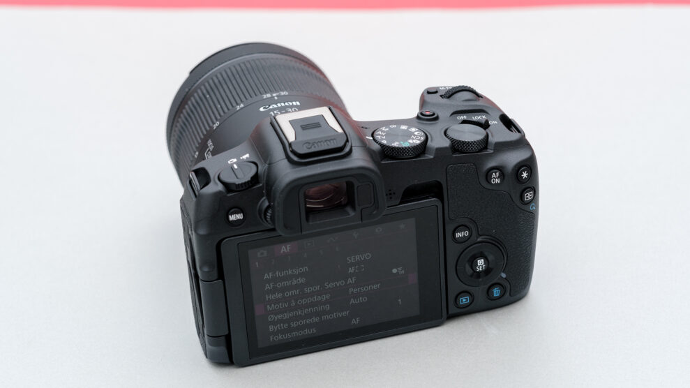 Kameran saknar styrpinne på baksidan, så man får flytta fokuspunkter med fingret och den vridbara skärmen i stället. Sökaren är stor, men inte särskilt skarp jämfört med den på EOS R6 II.