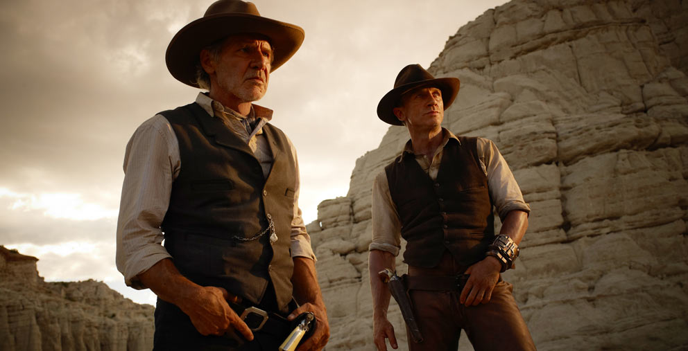 Daniel Craig är den ensamma ryttaren som vaknar upp med minnesförlust mitt ute i ödemarken med ett enormt metallarmband kring handleden. Efter en snabb expediering av några tvivelaktiga typer rider han in i den sömniga staden – där det hänger affischer som säger att han är efterlyst. Han kommer i bråk med sonen till den cyniske boskapsägaren, Harrison Ford, och får tillbringa natten i arresten. När han ska transporteras till fängelset lyses himlen upp och små rymdskepp invaderar den lilla staden – samtidigt som Craigs armband förvandlas till ett alldeles förträffligt utomjordiskt vapen!