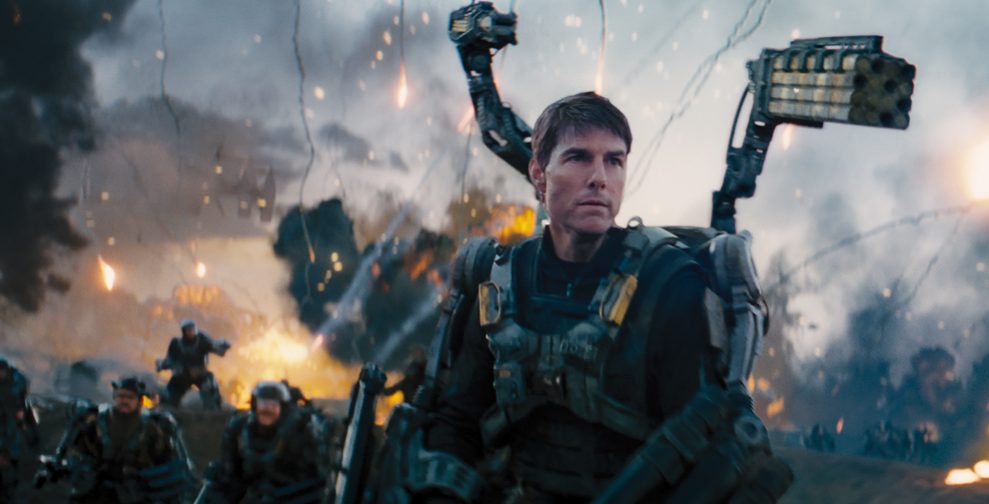 Cage blir ytterst motvilligt utkommenderad i strid av sin brittiska överordnade (Brendan Gleeson) och dör, naturligtvis, efter ett kort anfall som är rena massakern på den franska stranden. Omedelbart efter sin brutala död vaknar han dock till liv igen – dagen innan! Sedan upprepar sig mardrömmen igen och igen och igen …