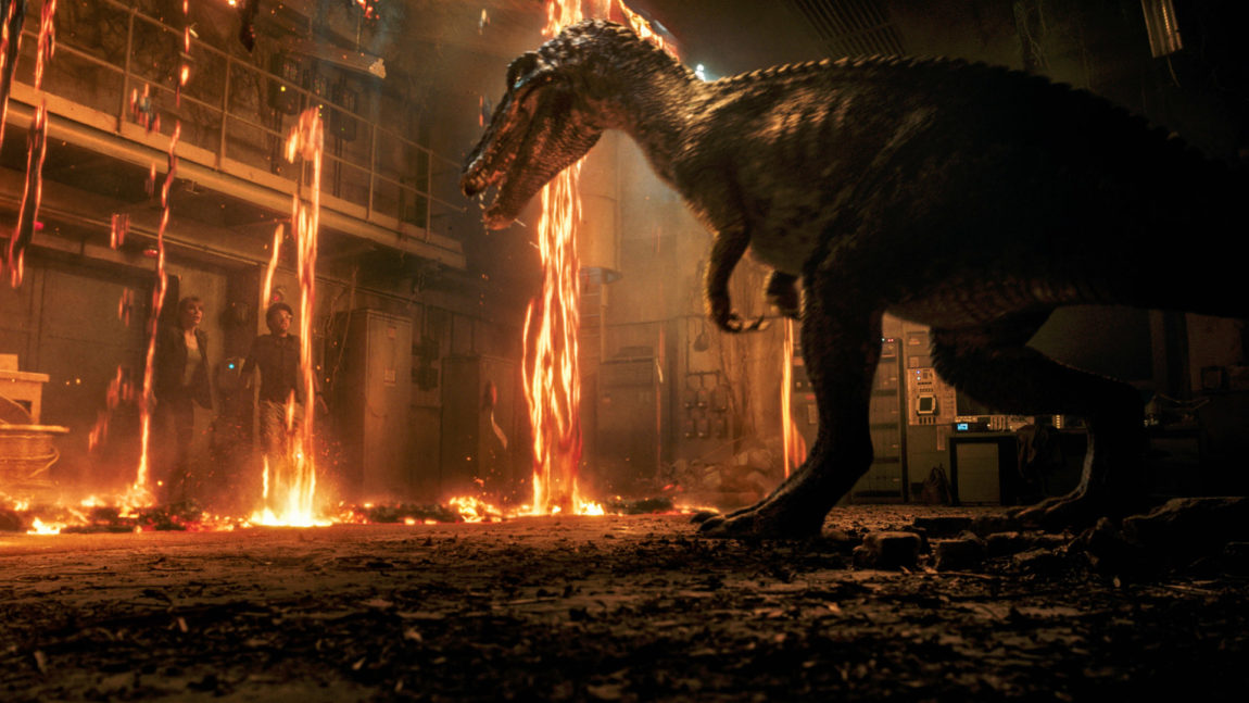 Vi får vara med om en imponerande, halsbrytande scen med dinosaurier i vild panik och flygande klippblock, ackompanjerade av lavaströmmar och askmoln, innan allt flyttas till en herrgård i USA – men ingen fara, detta är ingen ny The Lost World. Här måste Claire och Owen försöka befria dinosaurierna (en bra idé?), besegra skurken Eversoll (Toby Jones) och hans babianer, samt sätta Lockwoods dotter i säkerhet.