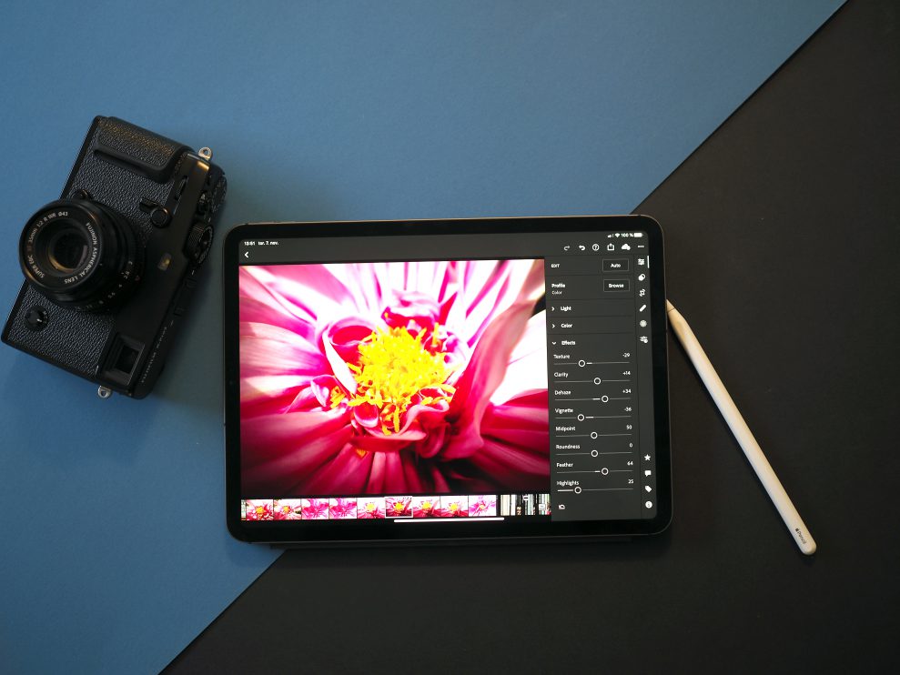 Fyra av de bästa foto-apparna – Photoshop, Lightroom, Affinity och Pixelmator – fungerar utmärkt på en vanlig iPad av modernare snitt, men allra bäst på en iPad Pro. Det är den mest kraftfull iPad-modellen, som finns i två skärmstorlekar, 11 och 12,9 tum. De är faktiskt så potenta att de matchar många bärbara datorer vi har testat på rena prestanda. Tjockleken är knappa 6 mm, vikten under halvkilot för 11-tummaren (633 gram för 12,9-tummaren) och båda slinker lätt ner i en liten kamerabag.