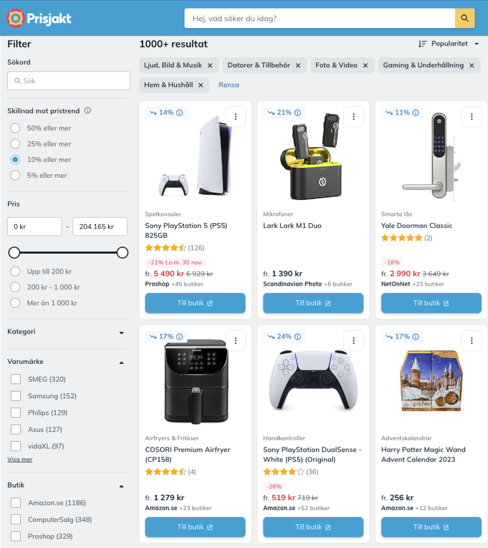 Håll koll på sajter som Prisjakt och Pricerunner. Dessa sidor samlar erbjudanden från olika butiker så att du enkelt kan jämföra priser. Sätt prisbevakning på de produkter du vill ha.