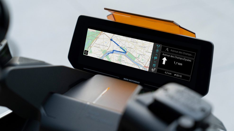 BMW Motorrad Definition CE 04 har en stor 10,25-tums skärm som visar info om hastighet, återstående batteritid och liknande. Den är också ansluten till användarens mobiltelefon. Inkommande samtal och meddelanden, och vi räknar också med kartor via CarPlay och Android Auto, visas på den här skärmen. Infotainmentsystemet har också en egen kartnavigering inbyggd.
