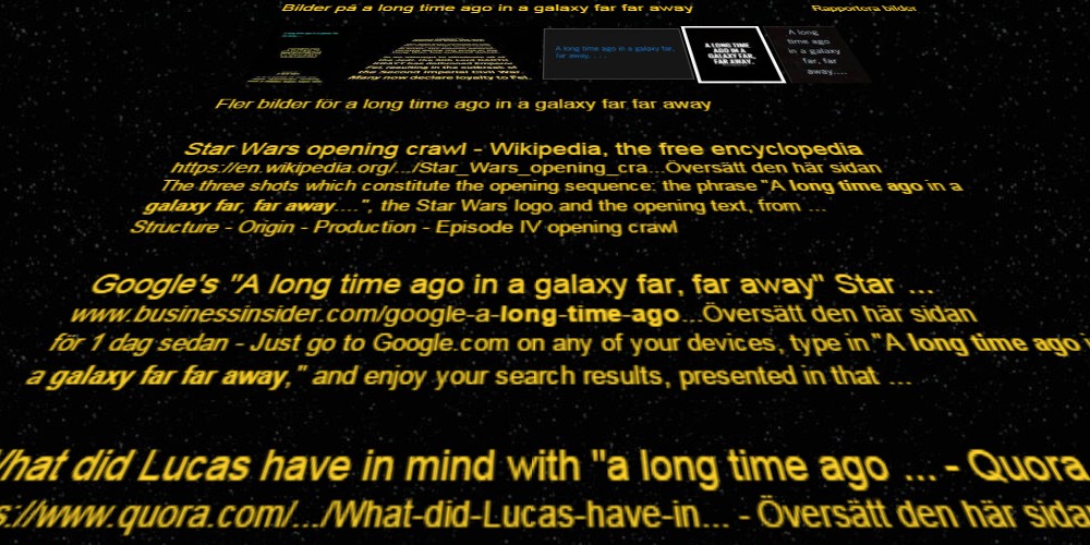 Men det vore inte Google om de inte också hade smugit in ett ”påskägg”, det vill säga en rolig gömd funktion. Prova att söka på ”a long time ago in a galaxy far far away” (utan citattecken) så får du upp ett sökresultat som visas på ett lite annorlunda sätt…