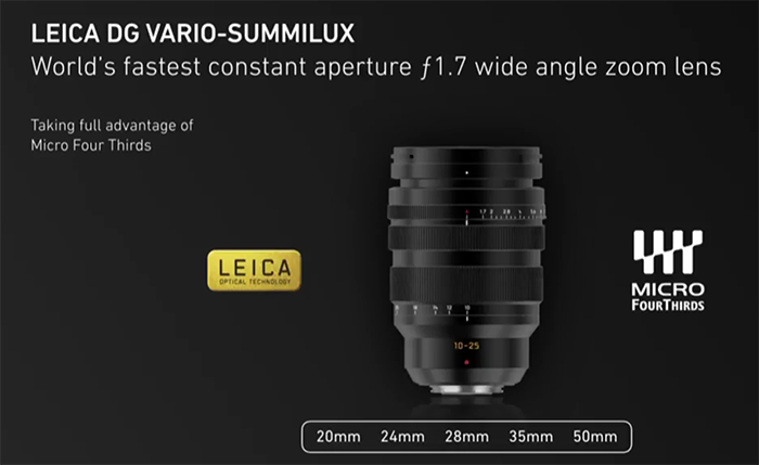 Den nya 10–25 mm-zoomen (som motsvarar 20–50 mm) med ljusstyrka f1,7 är anpassad för Micro Four Thirds-systemet (MFT) och heter GD Leica Vario Summilux 10-25mm F1.7.