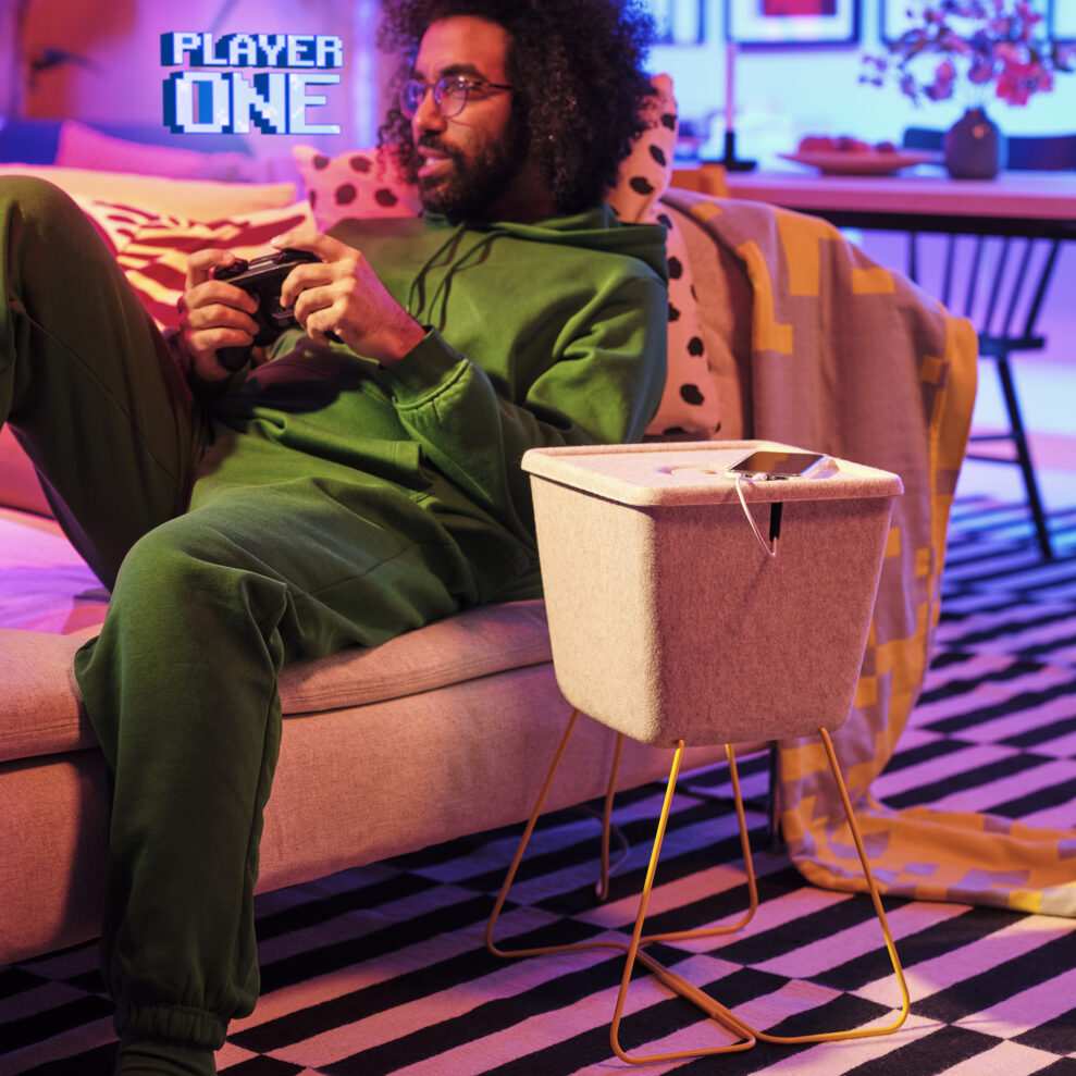 Fokus ligger på bekväma sittplatser, inklusive ergonomiska stolar och en uppblåsbar stol som bryter av mot traditionella gamingmöbler. Dessutom innehåller kollektionen en gamingstation som med sin vikbara bordsskiva och diskreta förvaringsmöjligheter enkelt förvandlar spelplatsen till en möbel när spelandet är över.