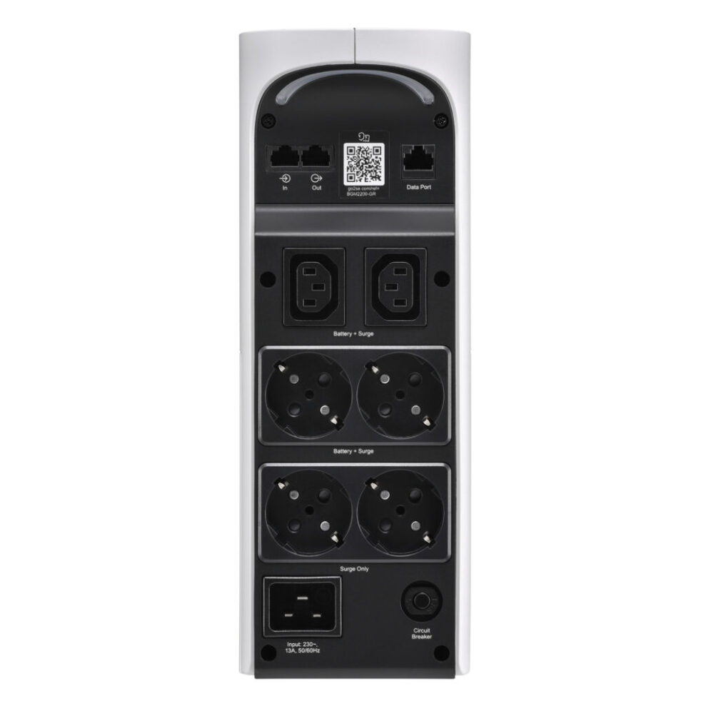På baksidan finns fyra uttag med batteribackup samt ytterligare två uttag designade för att skydda mot osäkra strömspikar och ”hårda avstängningar” som kan skada utrustning permanent.