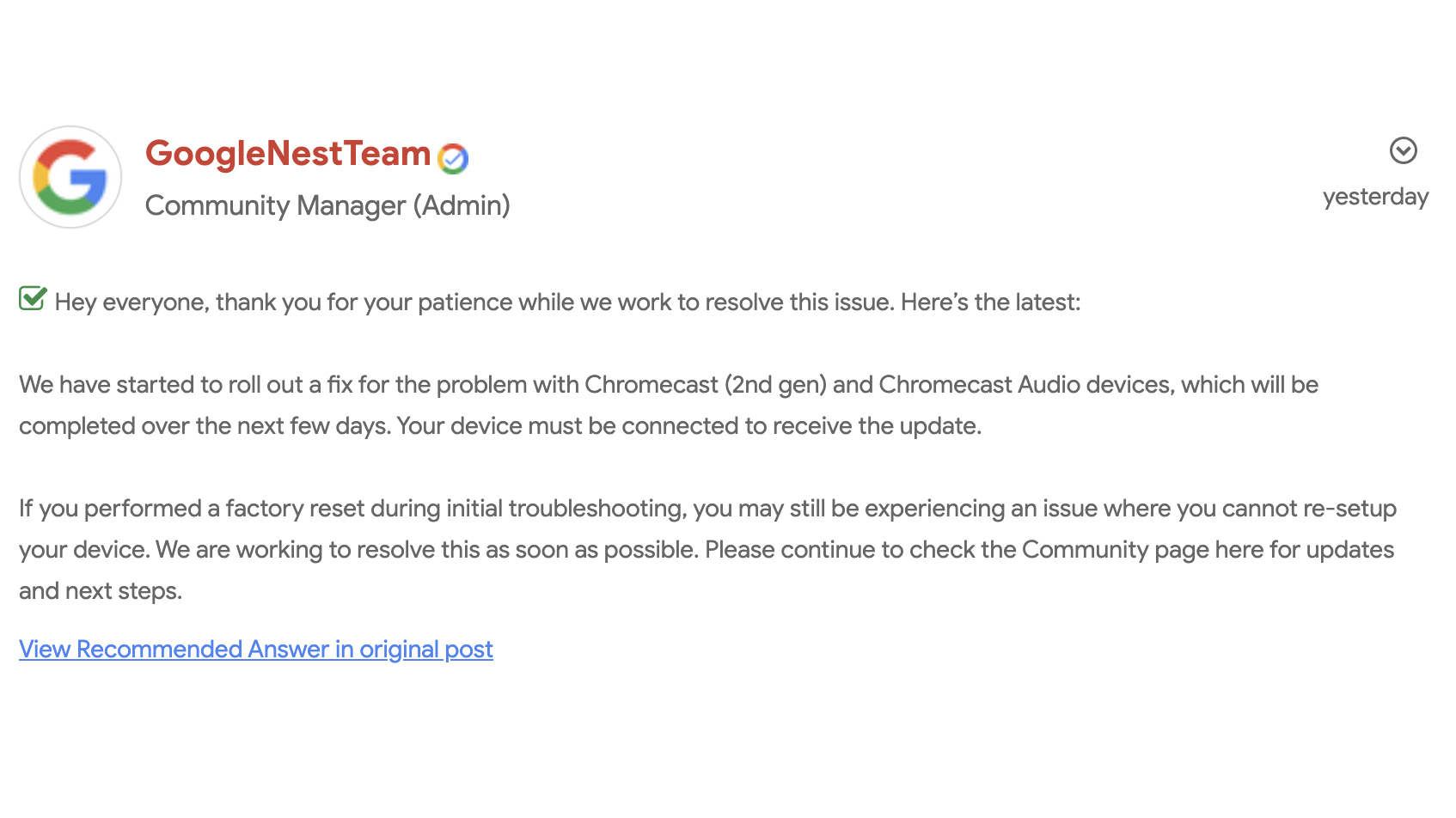 ”Vi har börjat rulla ut en lösning för problemet med Chromecast (2:a generationen) och Chromecast Audio-enheter, som kommer att slutföras under de närmaste dagarna”, skriver Google Nest-teamet i en färsk uppdatering på sitt forum.
