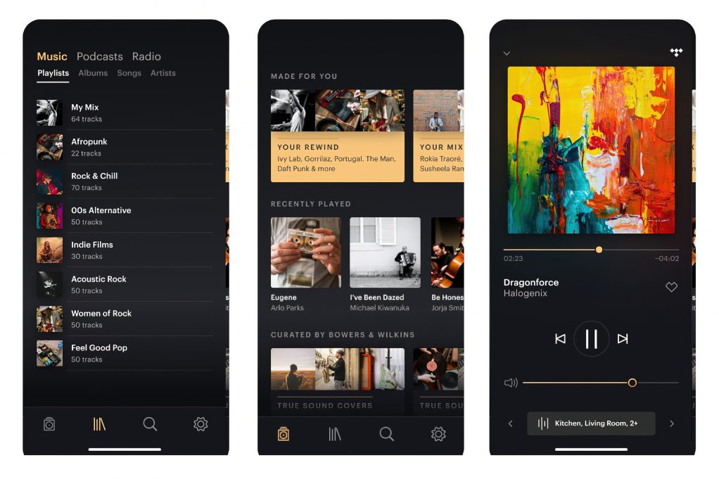 B&W Music-appen bakar in innehåll från olika strömningsplattformar i ett enda gränssnitt som utlovas vara både överskådligt och elegant. Här visas låtar, album, spellistor och radiostationer och B&W expanderar sedan detta med personliga rekommendationer och särskilda spellistor.