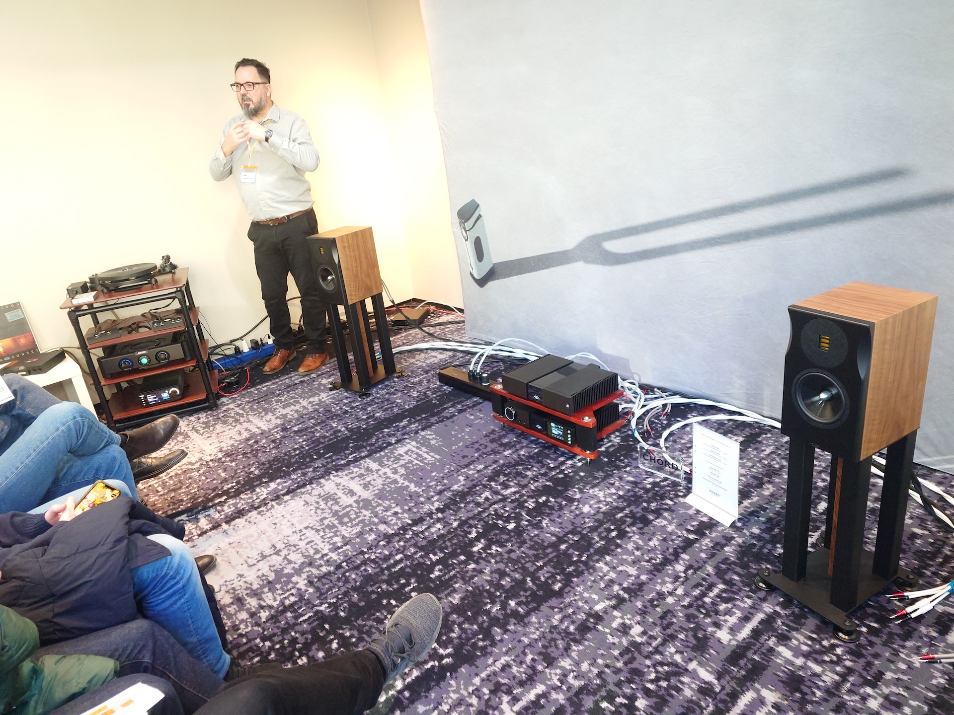 Ännu ett Audio Nord-rum, den här gången med elektronik från EverSolo och häpnadsväckande baspotenta små högtalare från svenska Guru Audio, vilket inte minst gällde stativhögtalarna som spelade upp under vårt (alltför) korta besök.