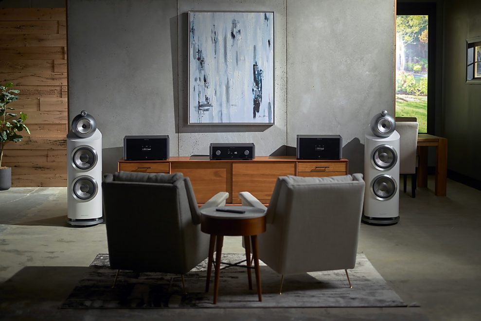 Michi-serien lanseras nu i november och på den här bilden syns förförstärkaren Michi P5 och två Michi M8 tillsammans med ett par B&W 800 D3: