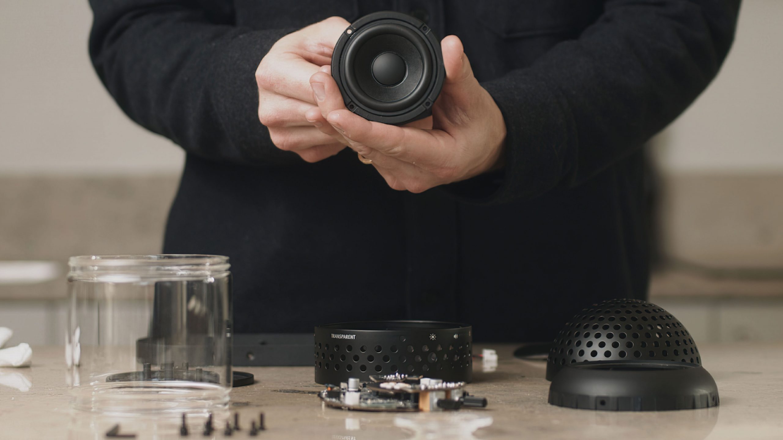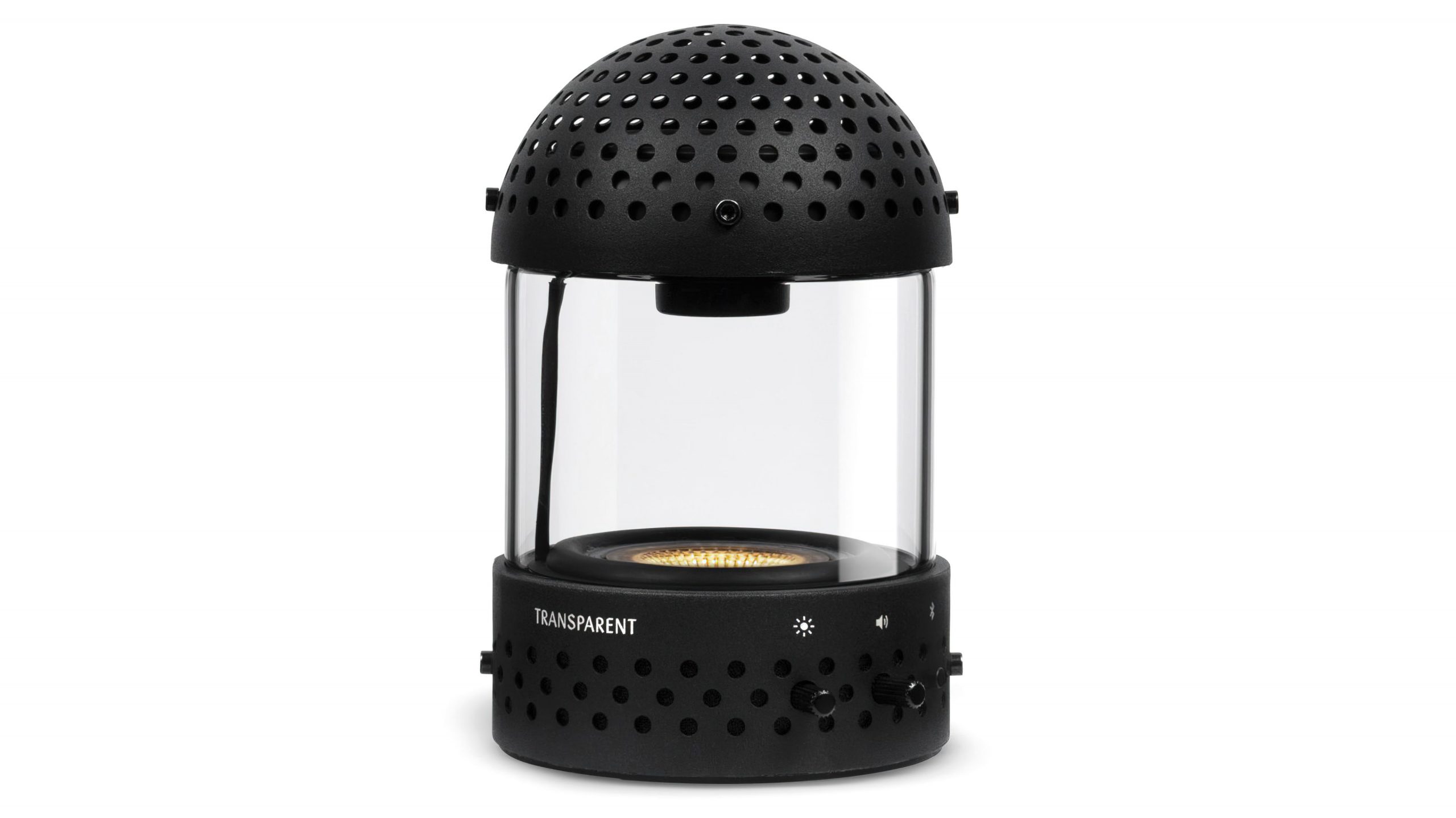 Transparent har sökt efter en tidlös design, och landade i en blandning av en rundstrålande högtalare och en glaslykta. De hävdar att aluminiumramen är utformad för att hålla en livstid, medan glascylindern tillåter oss att se den inre strukturen.