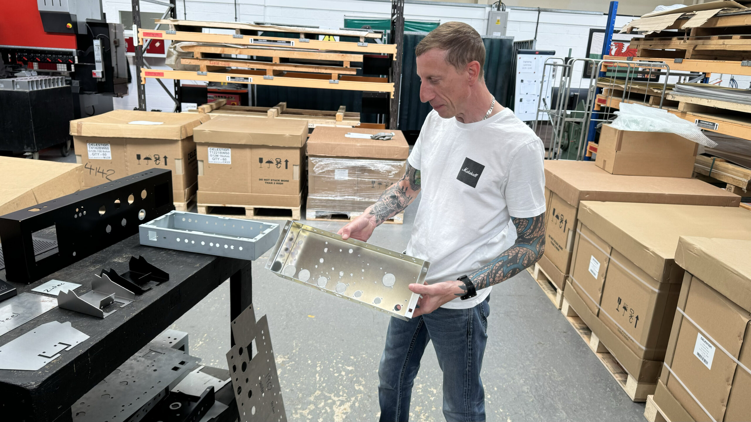 Marshall-fabriken i Milton Keynes utanför London är inte lik någon annan. Det känns nästan som om jag befinner mig mitt ute i ingenstans. Medan många högtalarfabriker satsar på automation och högteknologi, ligger fokus här på tradition och genuint hantverk. Kabinett i plywood, stommar i stål och aluminium och med rykande lödkolvar nästan vart man än vänder sig. Marshalls mest exklusiva gitarrförstärkare byggs fortfarande här för hand, precis som när Jim Marshall startade företaget 1962.