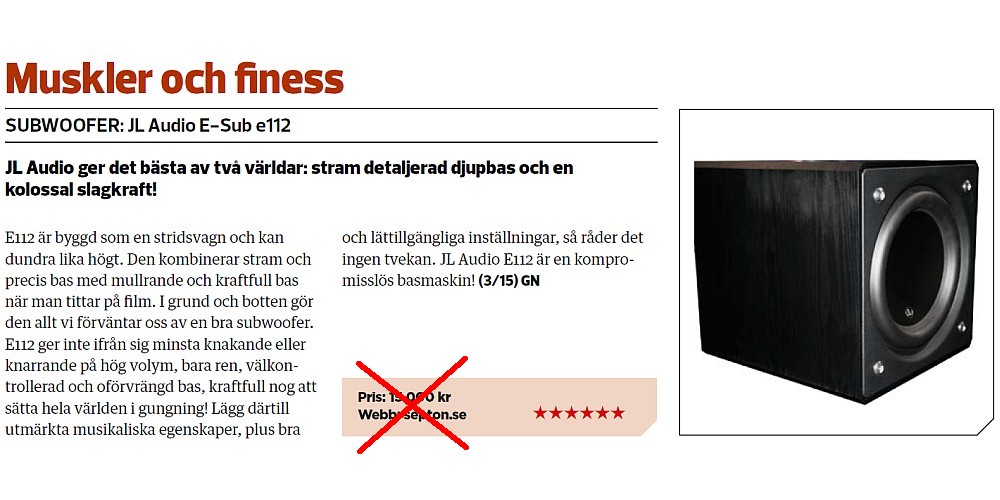 I kavalkaden hade det smugit sig in ett fel i högtalarkategorin. JL Audios subwoofer E-Sub e112 hade fått både fel pris och distributör. Vi ställer oss i skamvrån och erkänner. Rätt ska vara: