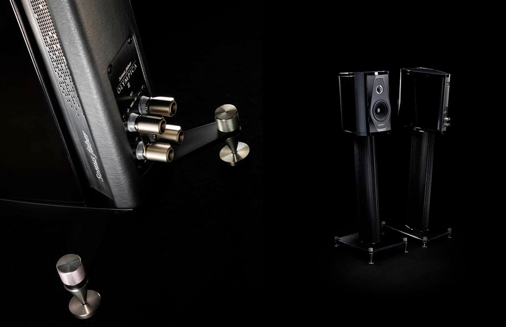 Nu kommer de båda – plus modellen mittemellan, Olympica II – i svart högglanslack, precis som flyglar. Fast ännu glansigare. Den svarta lacken är så jämnt påstruken att det nästan ser ut som om högtalarna är överdragna med en plastfilm.