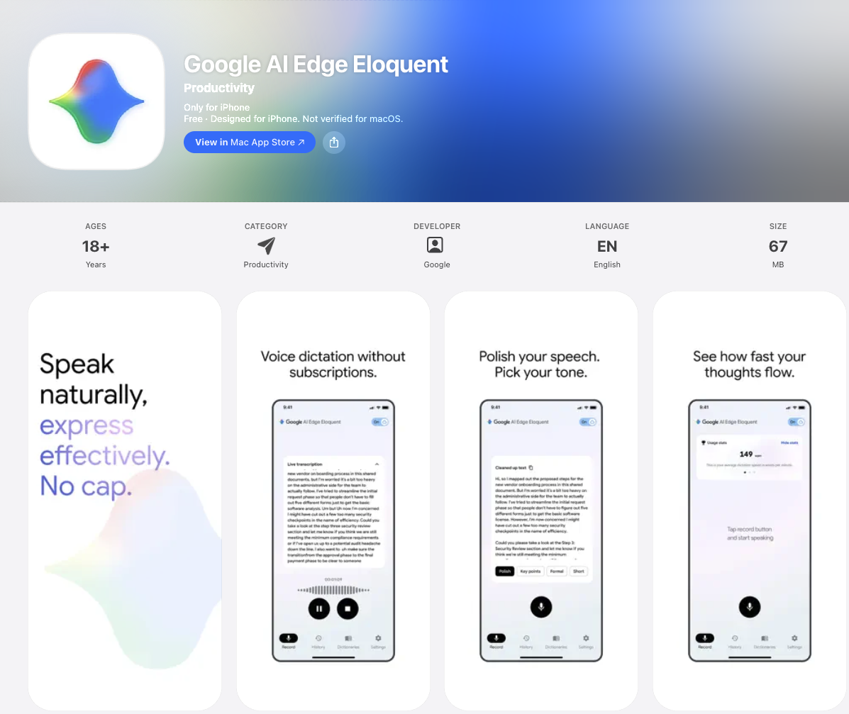 Naturligtvis finns det redan idag många tjänster och appar som låter dig tala in det du vill ha sagt och som förvandlar det till rättstavad text. Men många av dem kräver uppkoppling då transkriberingen görs i molnet. De bra kostar pengar. Och få av dem städar upp det du säger. Det påstås dock gratisappen Google AI Edge Eloquent göra och allt sker direkt i din iPhone. Appen släpps nämligen förvånande nog för iOS, inte för Android!