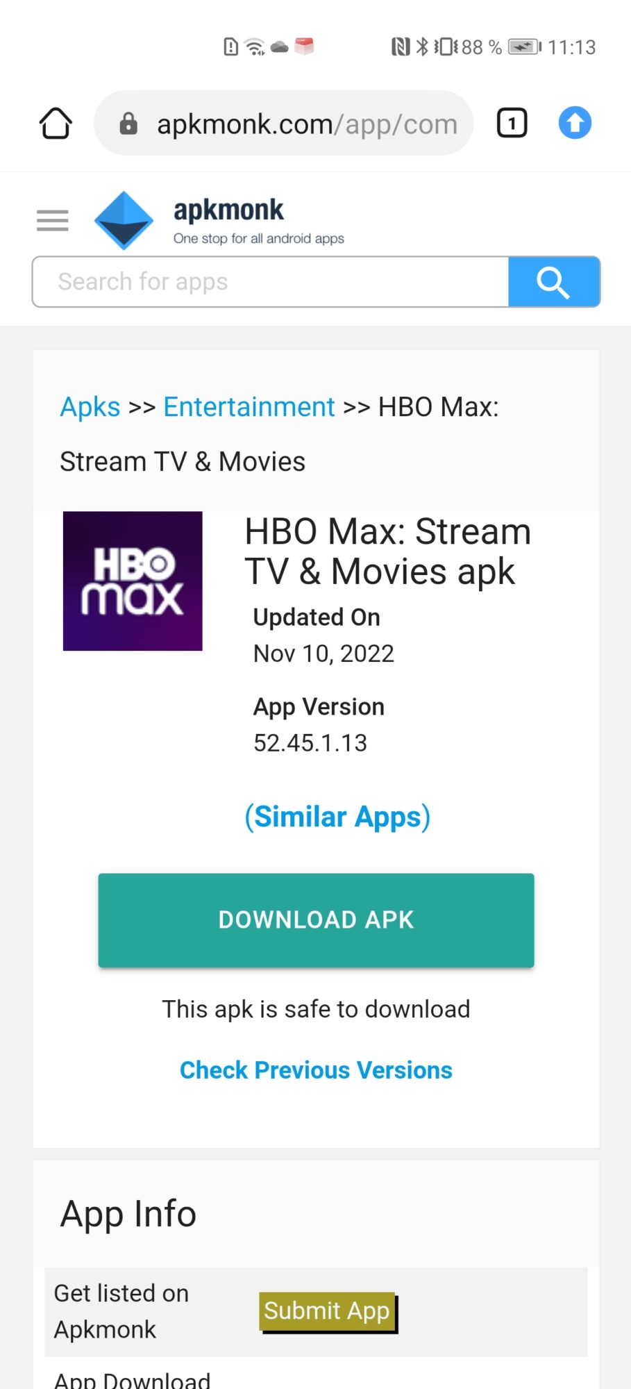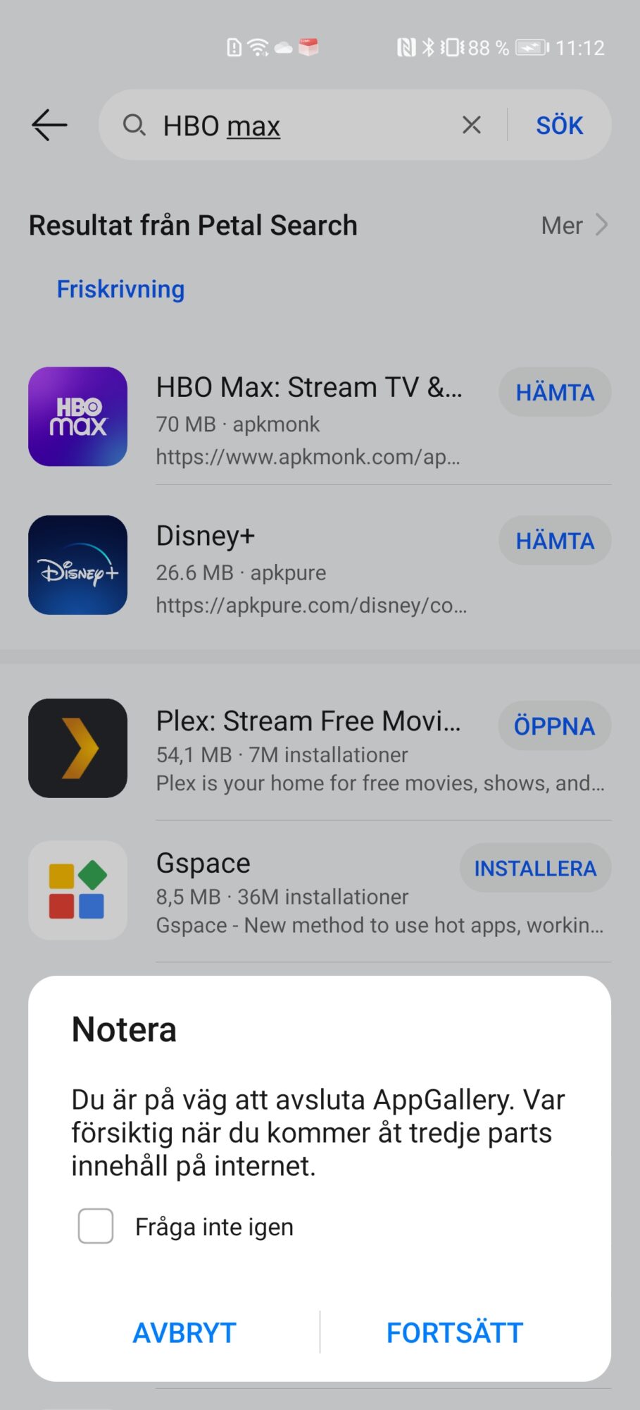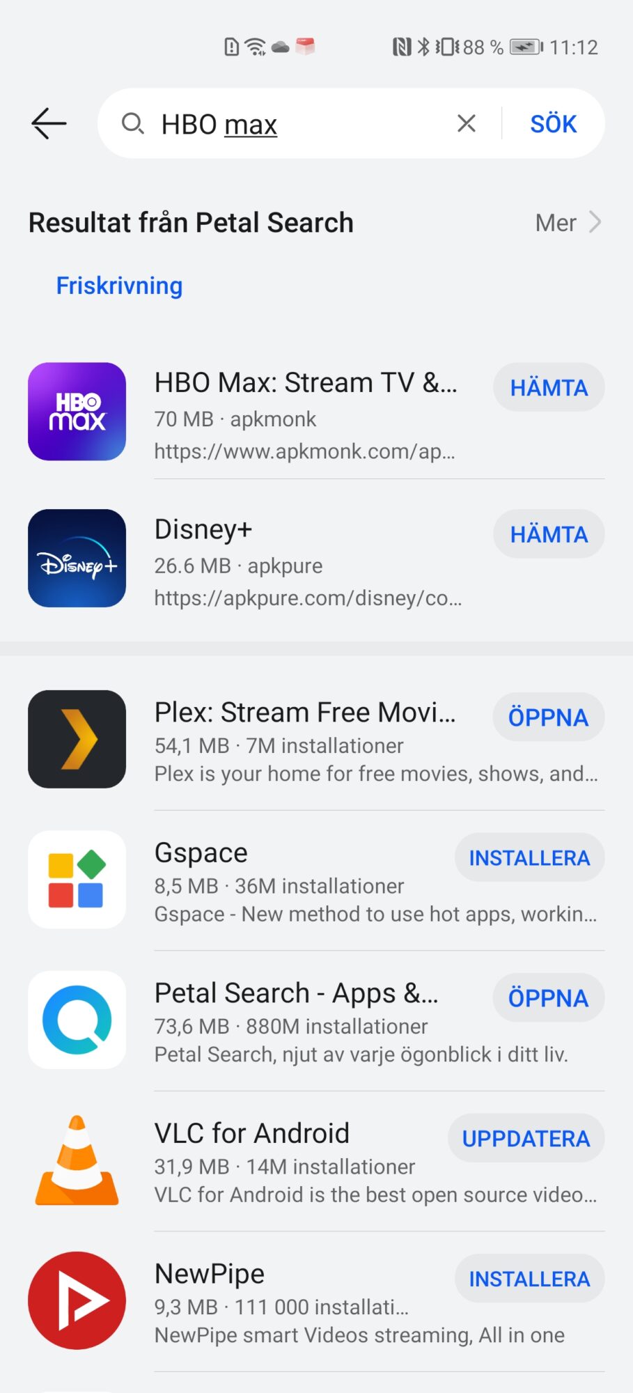 Naturligtvis testade vi instruktionerna och märkte snabbt att HBO Max-appen INTE kan laddas ner från själva AppGallery. Istället länkar den till en extern webbplats – apkmonk.com – varifrån du kan ladda ner appen som en så kallad apk-fil, som sedan kan installeras på mobilen.