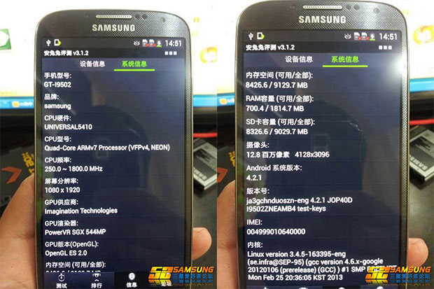 Vi har också rapporterat om att Galaxy S IV ska få en Exynos 5 Octa-processor med åtta kärnor, men det bekräftas inte direkt av bilderna, även om det kan bero på att processorn i utgångspunkt bara kör med fyra kärnor åt gången. Detta är dock ren spekulation från vår sida.