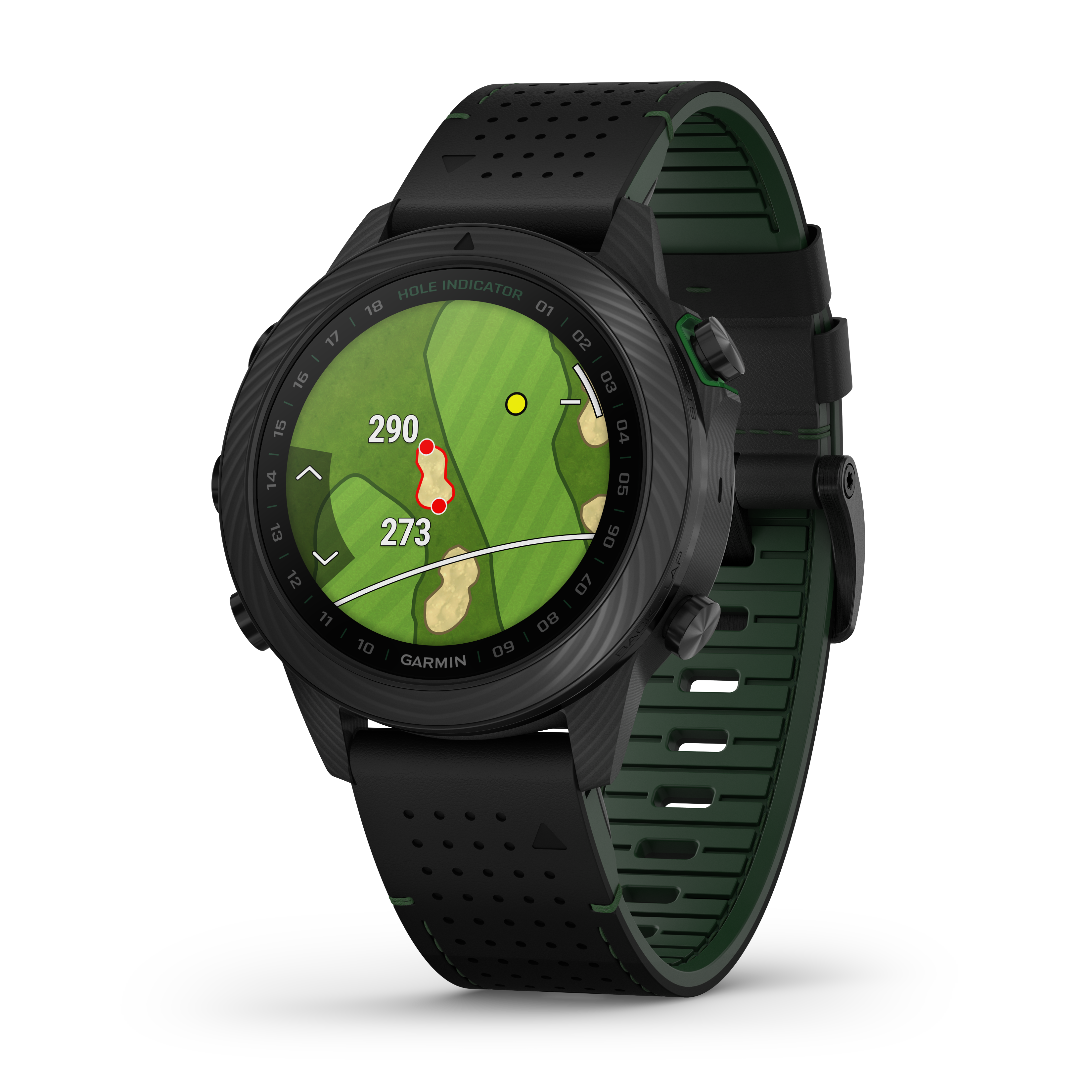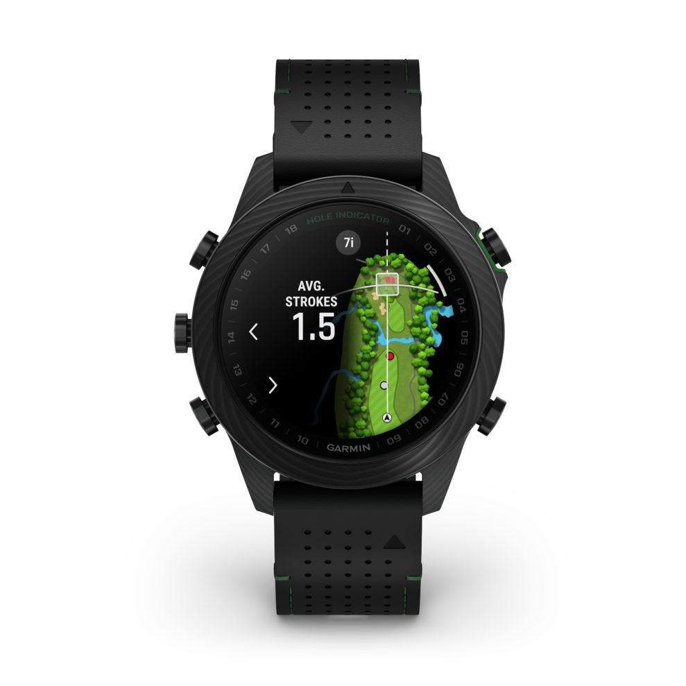 MARQ Golfer – Carbon Edition har 43 000 golfbanor inlagda. En virtuell caddie föreslår klubba baserat på vind, lutning och din svingdata. Med en prenumeration på Garmin Golf-appen får man dessutom se greenens lutningsriktning.