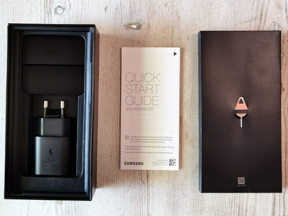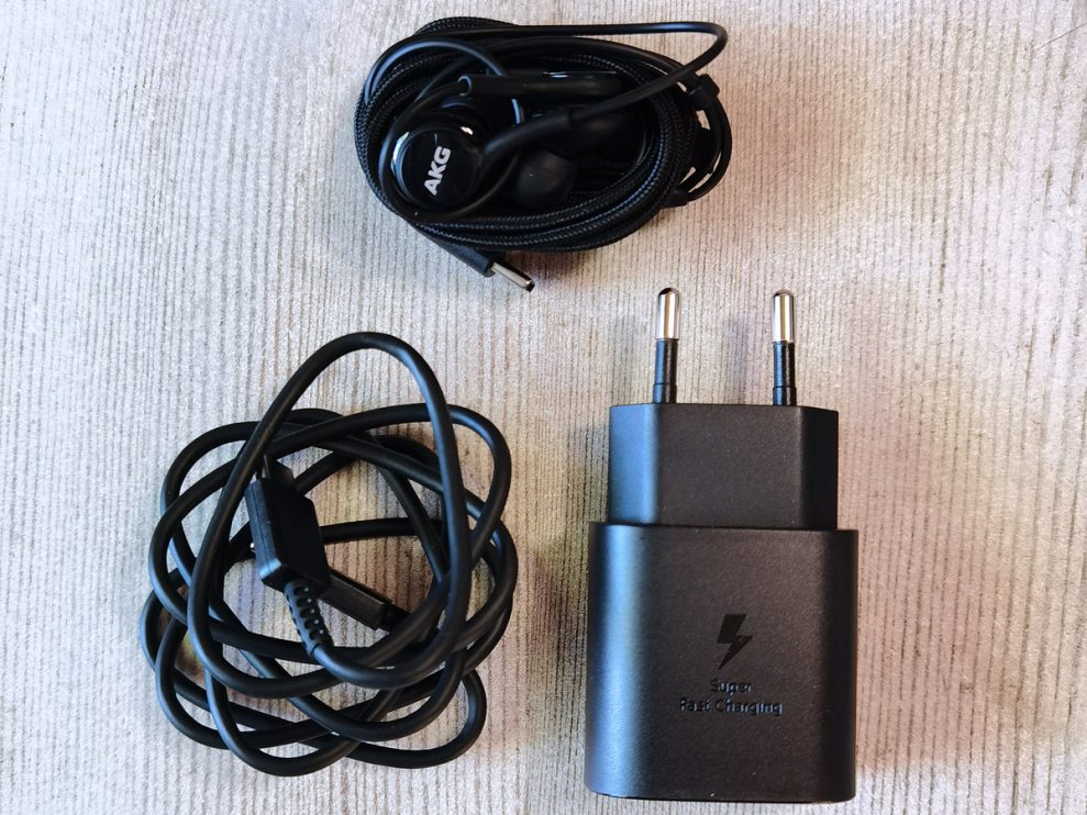 För att slippa klagomål på att det saknas hörlursutgång får man med ett par AKG-proppar med USB-C anslutning. Och en 25 watts PD-laddare som denna gång kallas ”Super Fast Charging”.