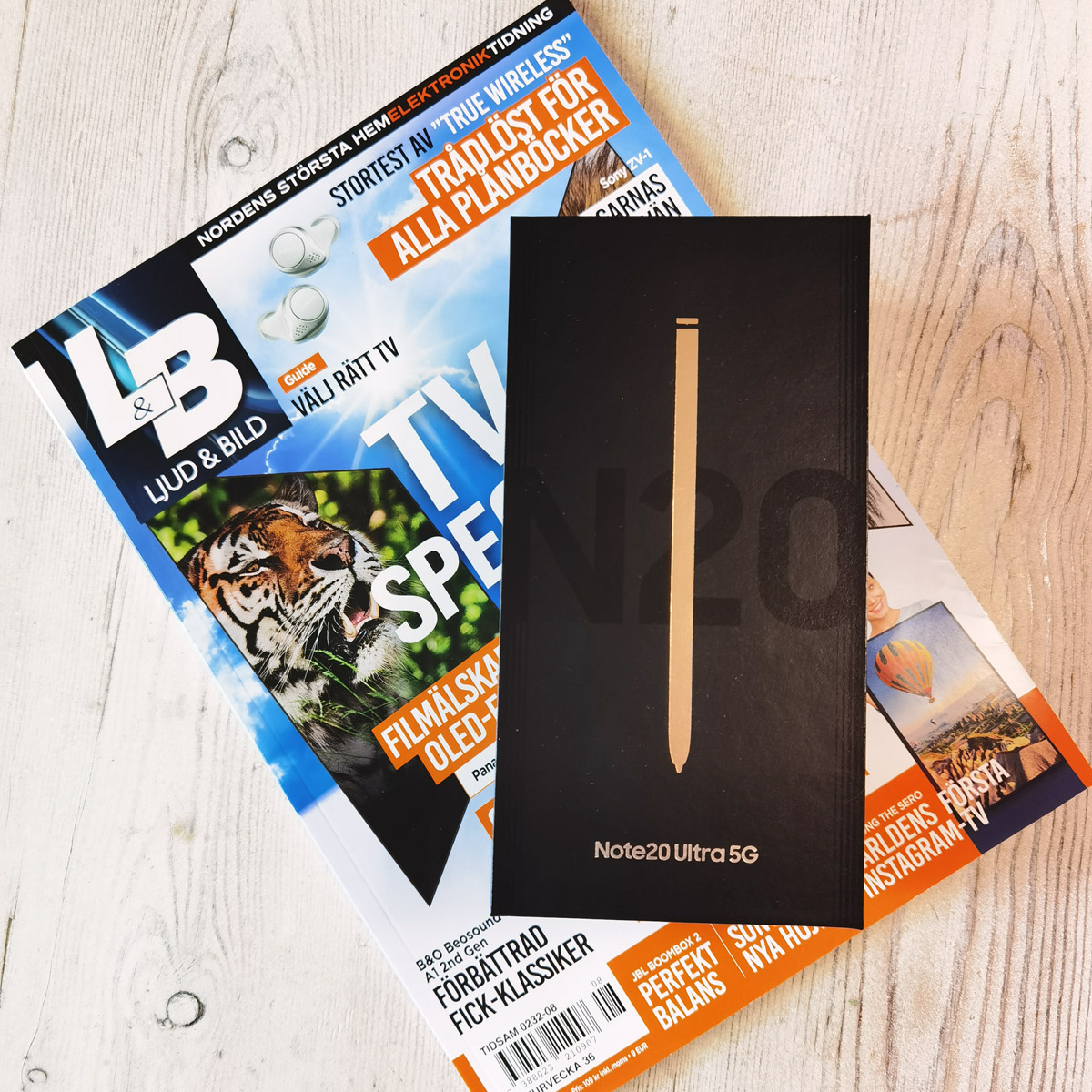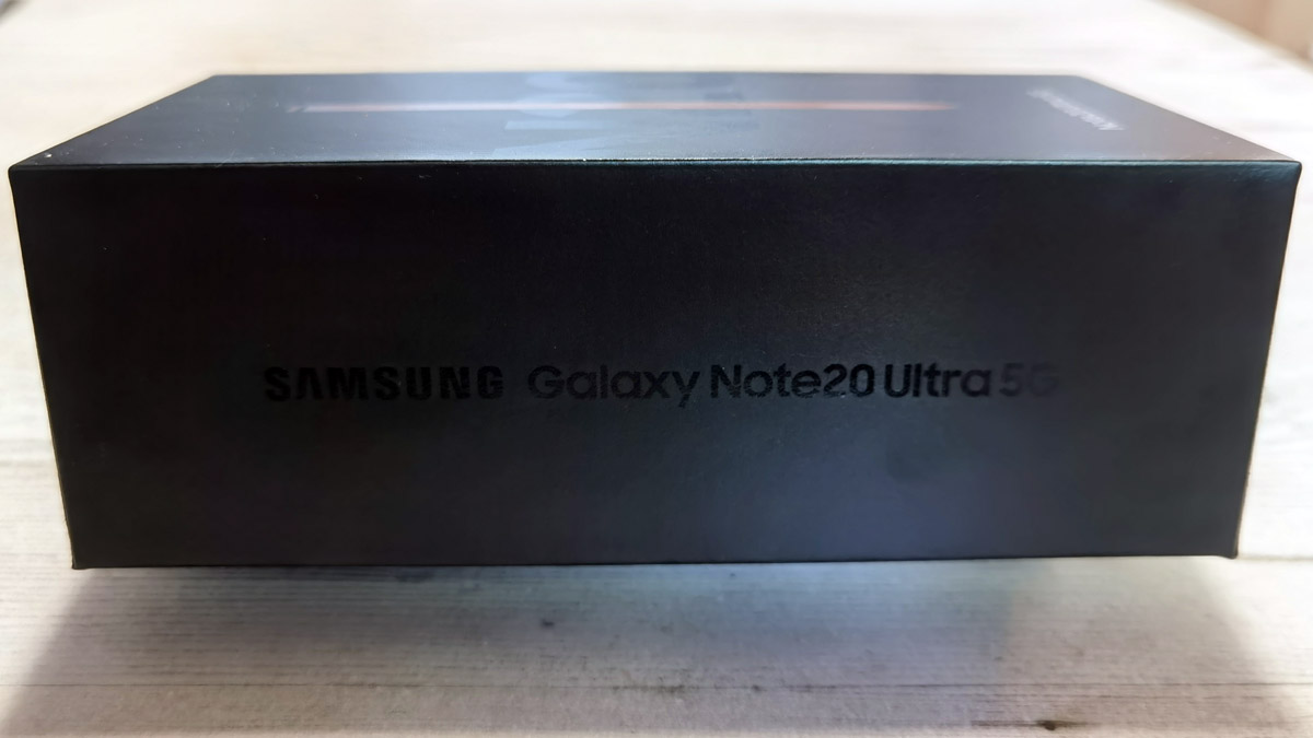 Förra onsdagen lanserade Samsung en fullständig flodvåg av nya produkter, som surfplattor, klockor och öronproppar. Men mest efterlängtad var nog Samsung Galaxy Note 20 Ultra, efterföljaren till Galaxy Note 10 som vi utsåg till årets premium mobil. Och nyss fick vi en leverans av en liten svart låda. Som synes av bilden ovan är det bara när ljuset speglar sig i en viss vinkel som man kan utläsa hela produktnamnet. Hemlighetsmakeri!
