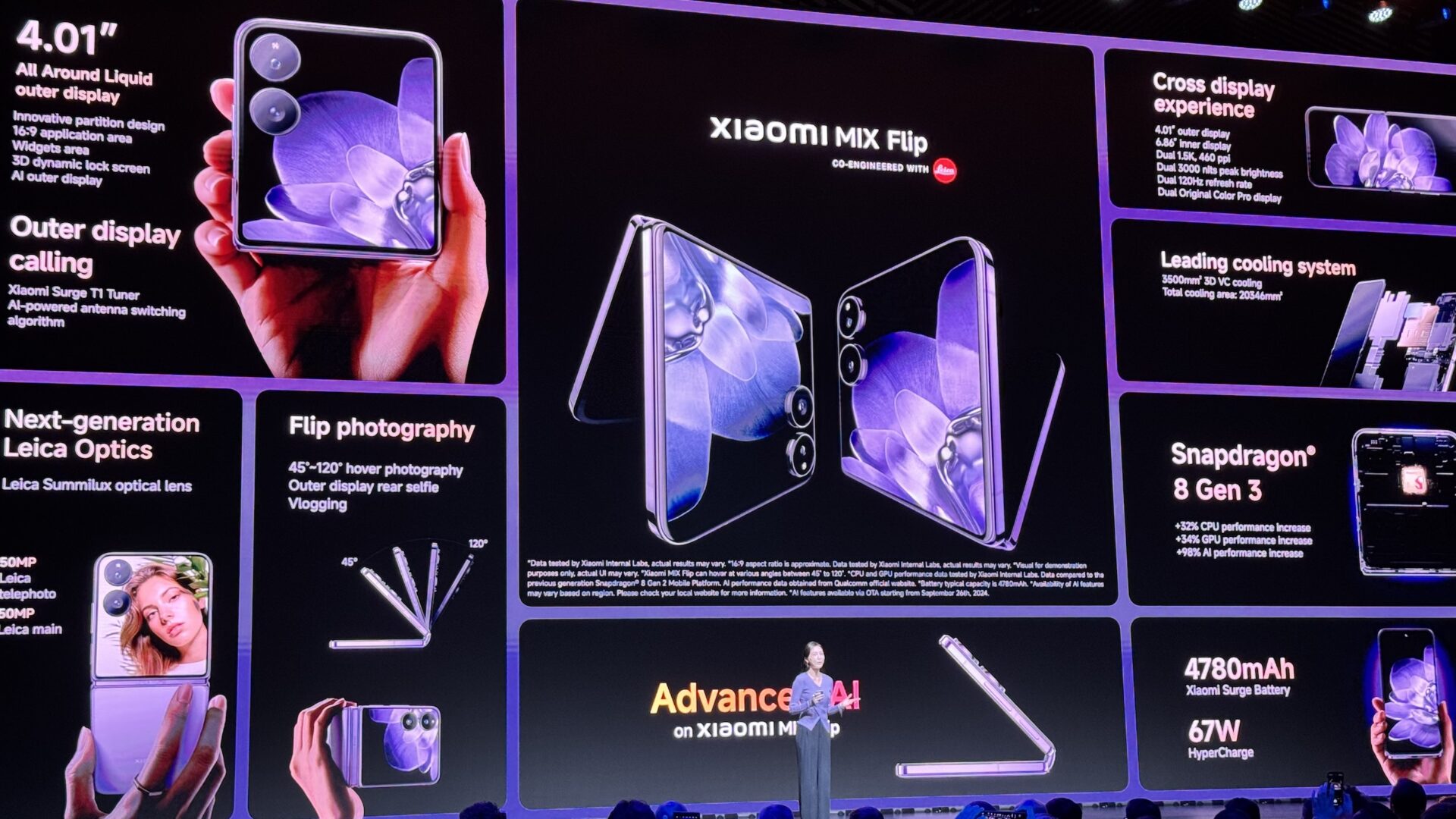 Förutom den tidigare nämnda 4,01” frontskärmen har Xiaomi Mix Flip en 6,86” vikbar skärm, som båda har 1,5K-upplösning, 120 Hz uppdateringsfrekvens och en maximal ljusstyrka på 3 000 nits. En Snapdragon 8 Gen 3-processor med inbyggd kylning sitter under skärmen, och telefonen är också utrustad med dubbla Leica-kameror med 50 Mp vidvinkel- och 50 Mp teleobjektiv.