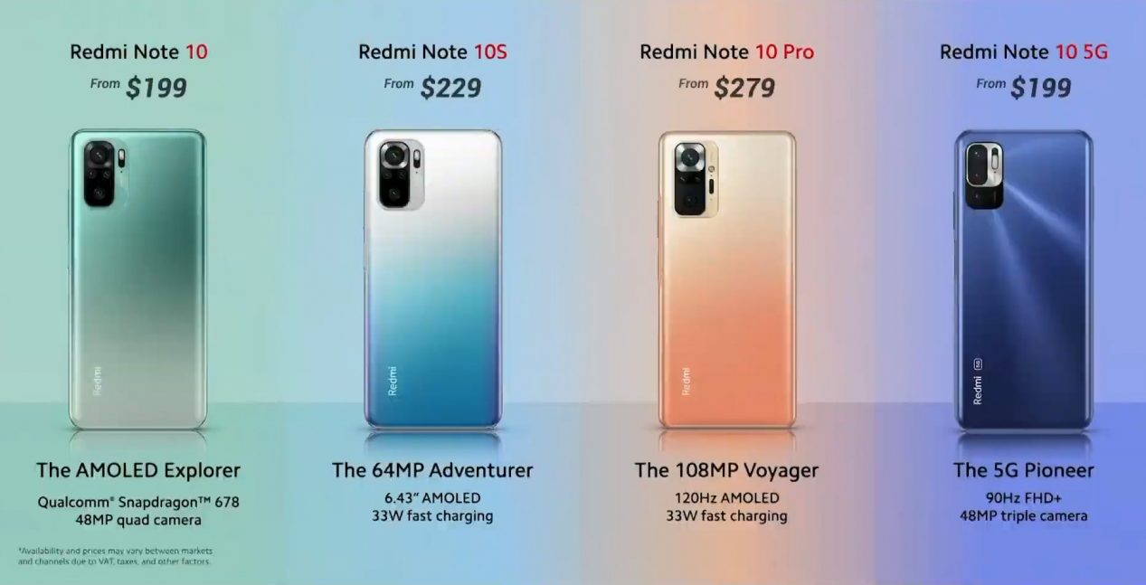 Både Redmi Note 10S och Redmi Note 10 är utrustade med en 6,4-tums AMOLED-skärm. Skillnaden mellan dem är att Note 10S har en huvudkamera på 64 Mp, medan Note 10 får nöja sig med 48 Mp. De andra kamerorna är en 8 Mp-vidvinkel, en 4Mp-makro och en 2 Mp-porträttdjupsensor. Även här får man med en 33 W-snabbladdare på köpet. Priserna börjar gissningsvis på 2 000 respektive 2 500 kronor. Båda mobilerna drivs av en Snapdragon 678-processor, som beskrivs som ”bra för vardaglig användning”.
