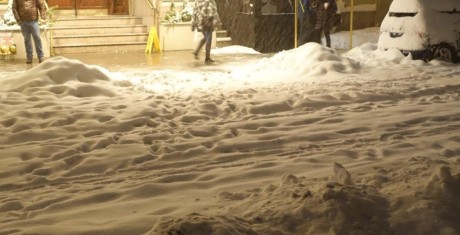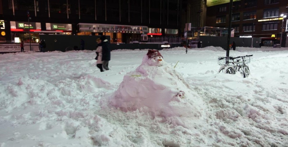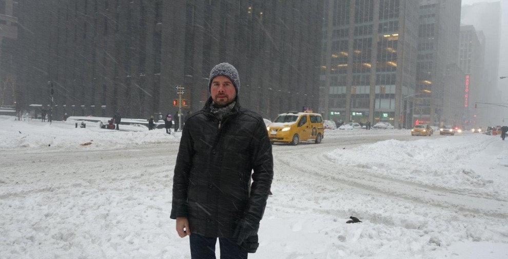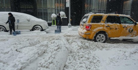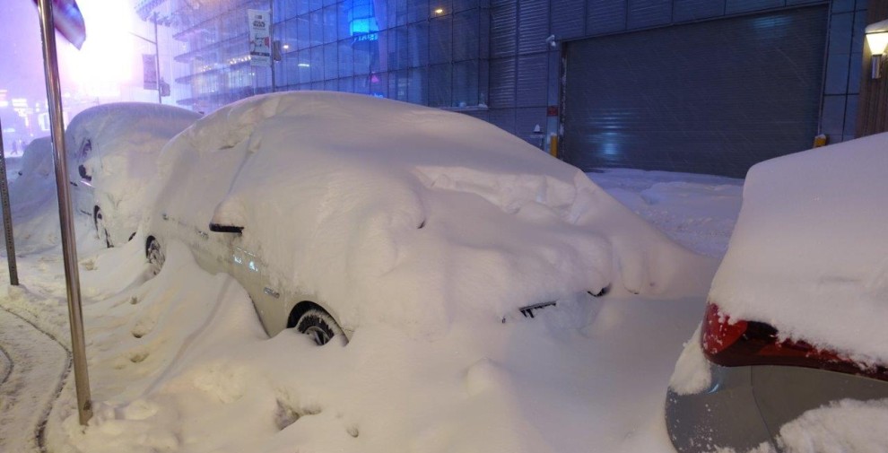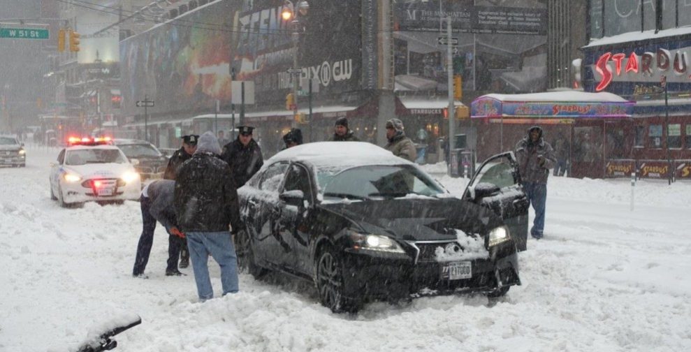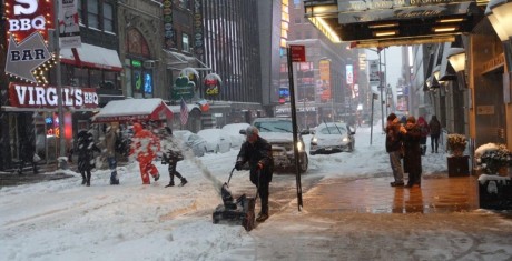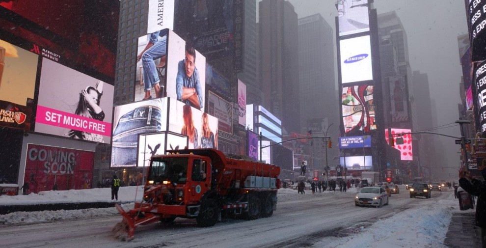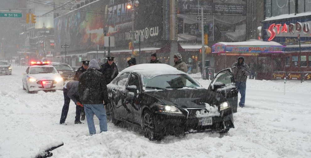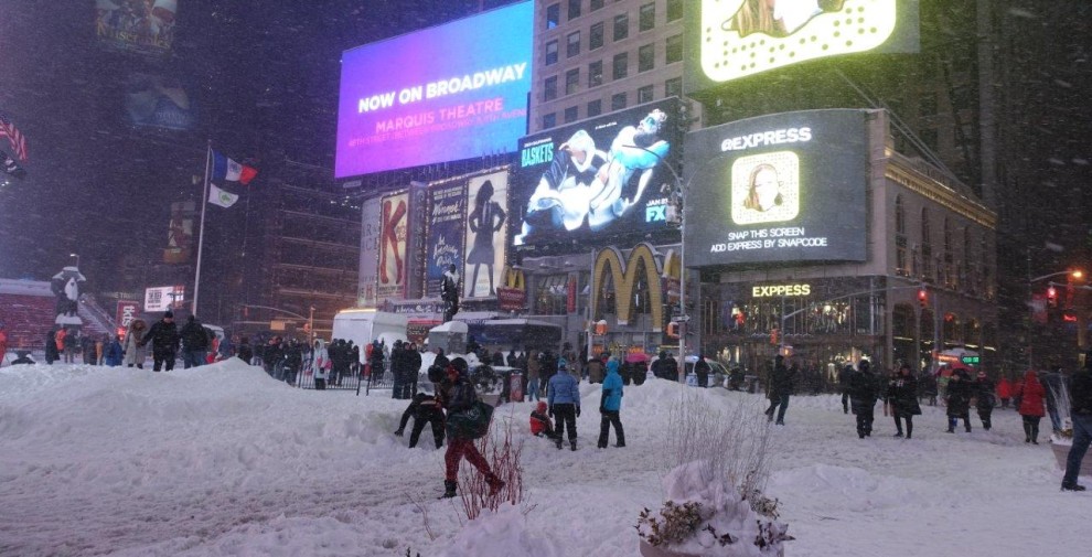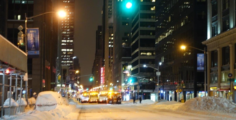 På gatorna i New York råder ett milt och behärskat kaos. Det ligger redan närmare 20 cm snö som en vit matta överallt och de (få) bilar som vågar sig ut glider runt på Broadway. Vinterdäck är uppenbarligen inte standard i New York.