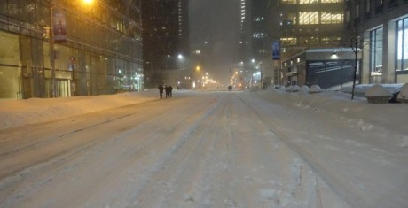 Klockan närmar sig lunch och efter en lättare måltid på ett nästan folktomt franskt brasserie drar vi oss tillbaka till hotellet för att tina upp. På CNN kan vi se att guvernören förklarar undantagstillstånd och förbjuder ALL trafik i New York City från och med 14:30. Snöprognoserna växer ständigt och man vill försäkra sig om att utryckningsfordon ska kunna ta sig fram. 14 personer har redan omkommit (3 dog när de skottade snö!). Det blir alltså en nästen total stängning av hela staden. Inga bussar, taxibilar eller personbild får köra på gatorna och närmare 15 000 flyg ställs in.
