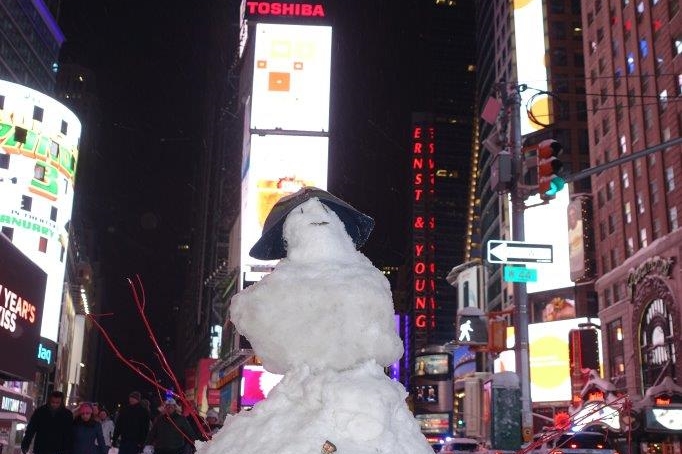 På Times Square är det redan stora snödrivor från plogbilarna och extatiska turister som älskar det exotiska extremvädret hoppar i snön och kastar snöbollar, och japanerna tar så mycket bilder att det nästan ryker om Samsung-mobiler. Vi rycks med och kastar en snöboll vi också.