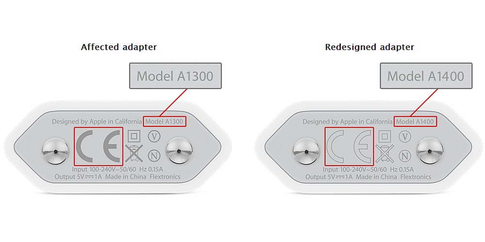För att se om din laddare tillhör dem, jämför med bilden ovan. Heter den Model A1300 och har ett ifyllt CE-märke har du en av dem. Står den Model A1400 och ej ifyllt CE-märke så är du säker.