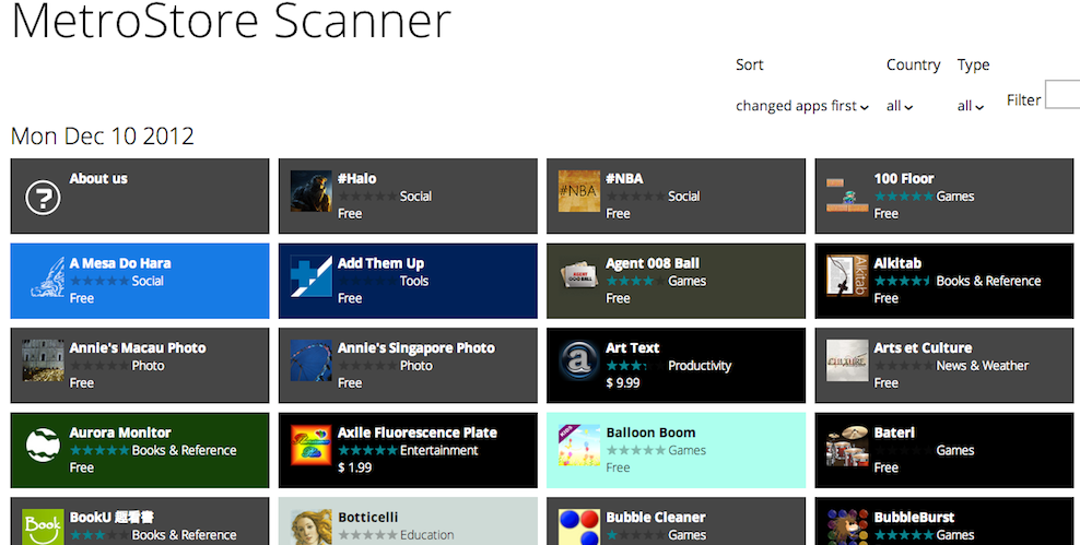 Det problemet löser webbtjänsten MetroStore Scanner, som ger tillgång till och överblick över absolut alla appar i Windows-butiken. Man kan också leta i olika kategorier samt söka efter olika länder.