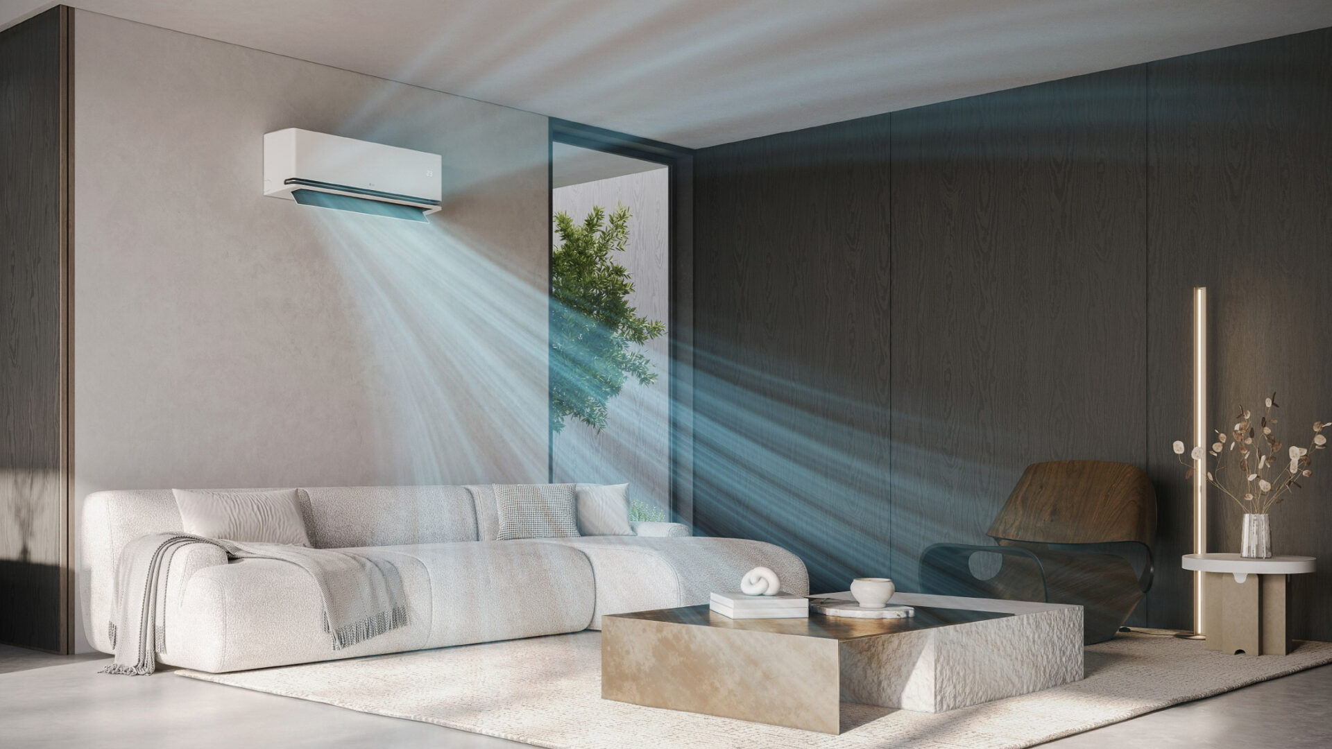 LG:s nya Dualcool-luftvärmepump är försedd med dubbla luftutsläpp – det ena riktat nedåt i rummet medan det andra är riktat svagt uppåt för att skicka luften mot taket och ner längs väggarna.