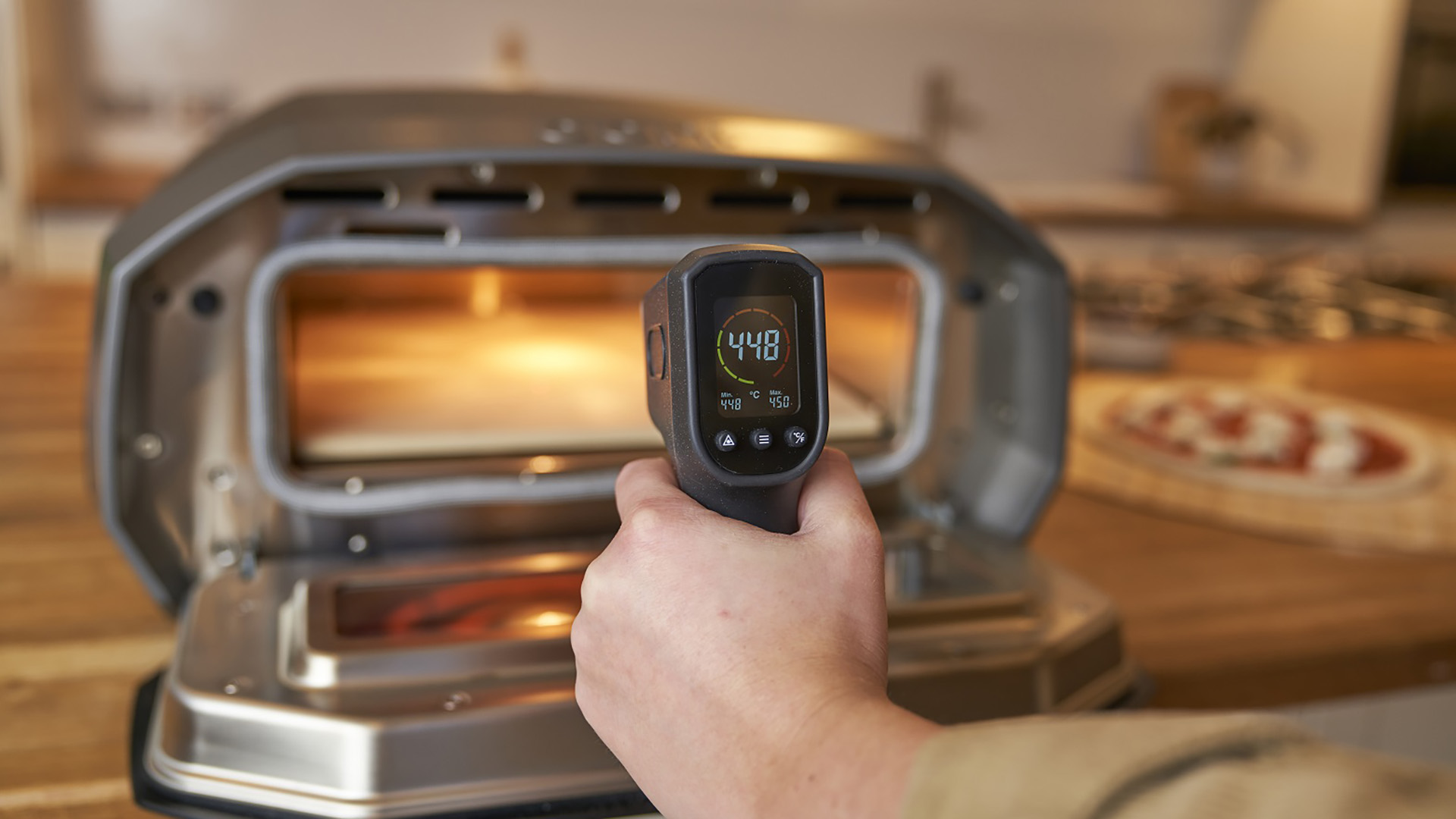 För att kunna sätta hårda siffror på konsten att baka har Ooni nu skapat Ooni Digital Infrared Thermometer, som läser yttemperaturen på din pizzasten från ett säkert avstånd. När den infraröda ljusstrålen träffar pizzastenen i ugnen läses temperaturen av.