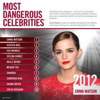 Visste du att den farligaste världsstjärnan som svenska internetanvändare regelbundet letar efter på nätet är stjärnan från Harry Potter-filmerna, Emma Watson, som spelar Hermione? Var åttonde länk i sökresultatet för Emma sägs vara farliga.. Kan vara bra att tänka på om du har ungdomar i ”Harry Potter-åldern” hemma, eller själv är inbitet fan.