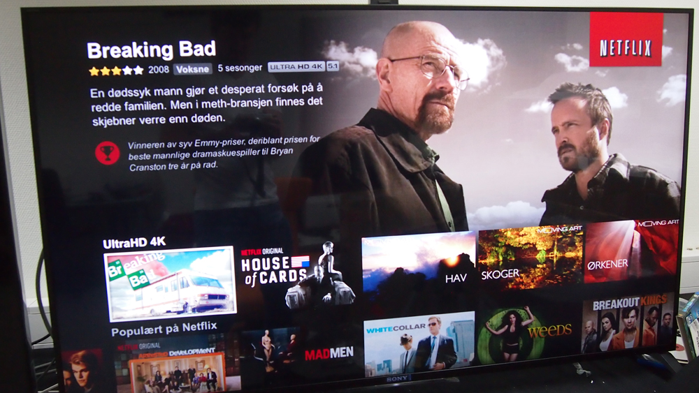 Nu går det att streama den populära TV-serien Breaking Bad i 4K-upplösning från Netflix. För att titta på samtliga 5 säsonger med den sluge och cancersjuke kemiläraren måste du ha en snabb uppkoppling på 15 Mbit/s eller mer, en 4K-TV som stöder videokodeken HEVC och Netflix-tjänsten i 4K-version. I dagsläget är det alla årets 4K-modeller från LG, Samsung och Sony.