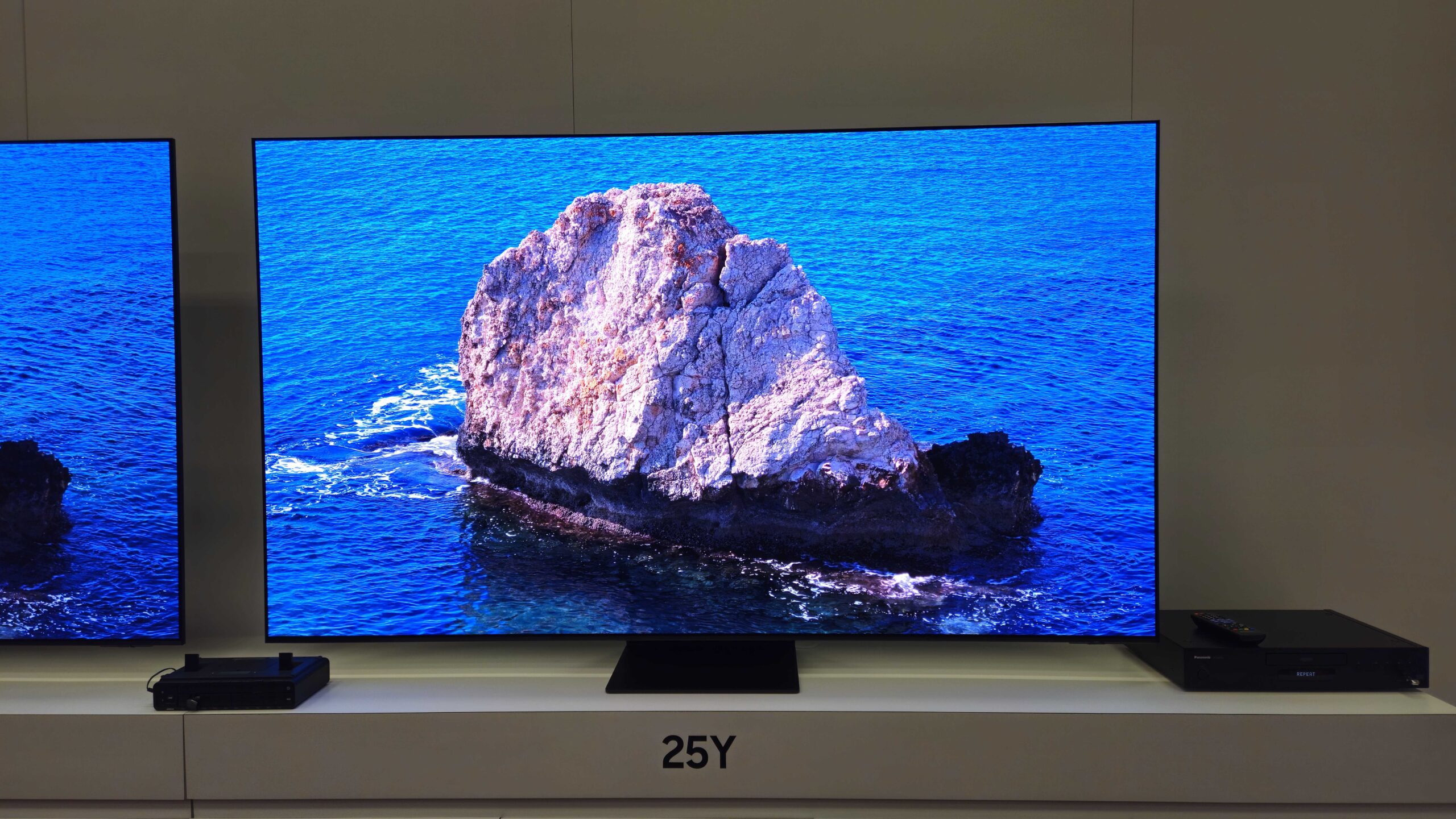 S95F använder den senaste QD-OLED-panelen från Samsung Display, och har också fått en ny och ännu mattare skärmyta. Detta har gjort det möjligt att uppnå ännu lägre ljusreflektion, även från sidorna, vilket bör minska den något irriterande effekten av att panelen ser gråare ut i dagsljus eller med starkt ljus från sidorna. Detta återstår att testa i ett rum med fönster, men det rådde ingen tvekan om att svartnivån var exemplarisk i demorummet. Detta beror också på att TV:n har en uppgraderad bildbehandling som anpassar sig ännu mer effektivt till ljusförhållandena i rummet.