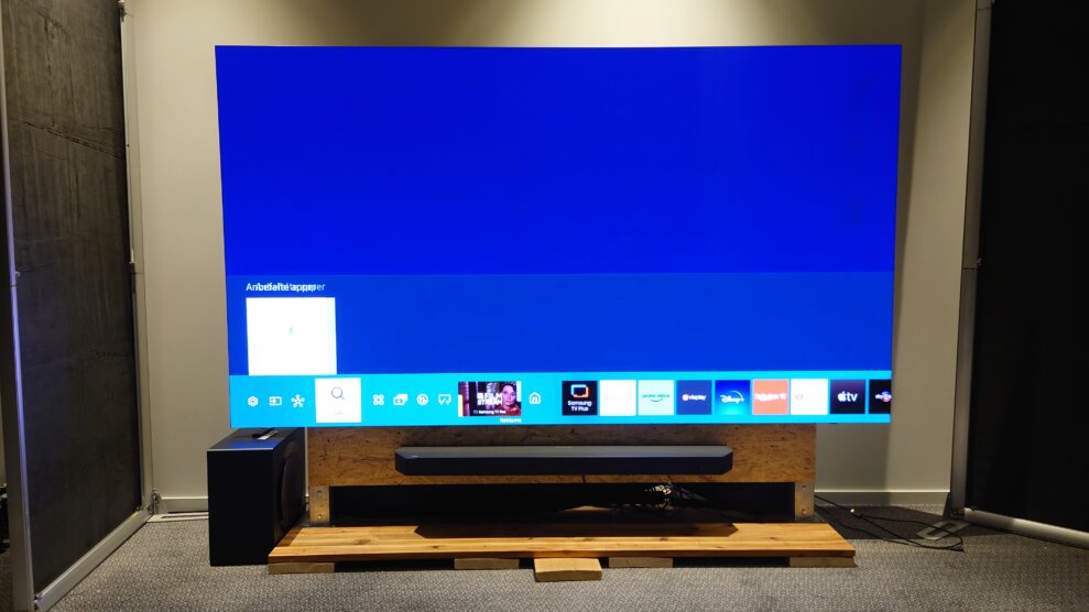 Enligt Samsung kommer den förmonterad från fabriken och levereras i en enorm kartong, förberedd för väggmontering. Med tanke på den prisklass vi befinner oss i kan du som köpare förmodligen förhandla om att få den monterad…