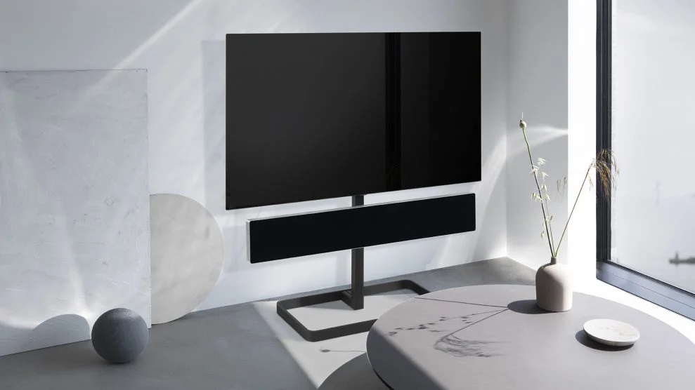 B&O betonar att stativet är avsett för permanent placering på golvet, utan vridfunktion eftersom det påstås kunna skada den tunna OLED-panelen. Däremot har det urfrästa spår som döljer kablarna till och från soundbar-högtalaren.