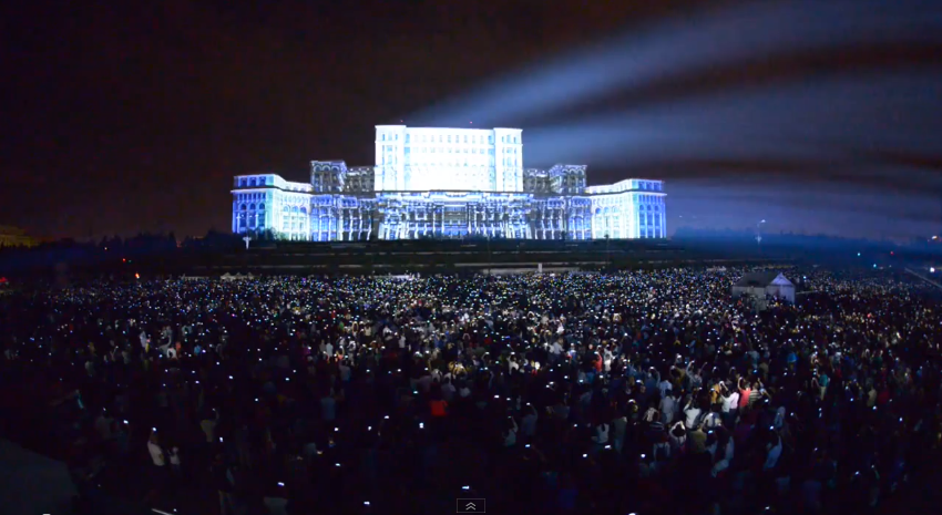 I samband med stadens 555-årsjubileum och evenemanget iMapp Bucharest 555 förvandlades palatset till en enorm utomhusbiograf. 104 Panasonic-projektorer av typen PT-DZ21K skapade tillsammans en sömlös bild med fasaden som filmduk. En speciell videoteknik, ”edge blending”, användes för att foga ihop projektorerna med hjälp av geometrisk mappning.