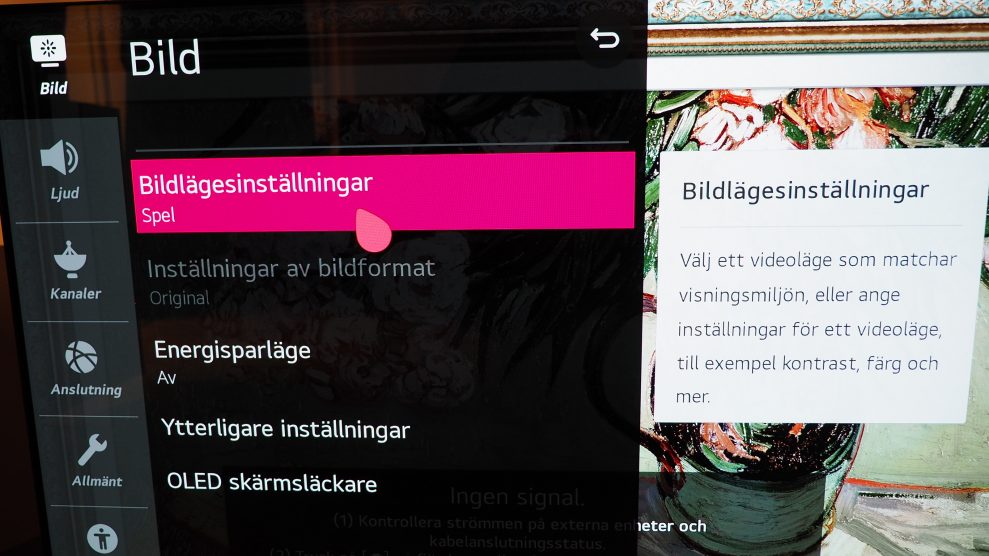 LG-skärmen upptäcker i normala fall anslutit en spelkonsol och väljer automatiskt spelläget. I annat fall kan du välja Spel-inställningen manuellt i menyn Bildlägesinställningar.