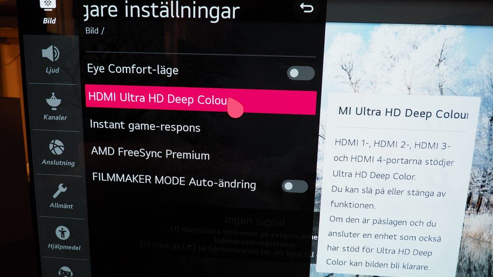 Gå till Alla inställningar -> Bild -> Ytterligare inställningar. Aktivera HDMI Ultra HD Deep Colour för vald ingång. Du kan också aktivera ögonblicklig spelrespons (Instant game response).