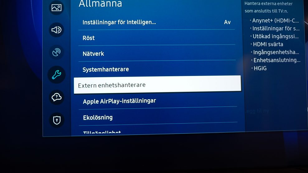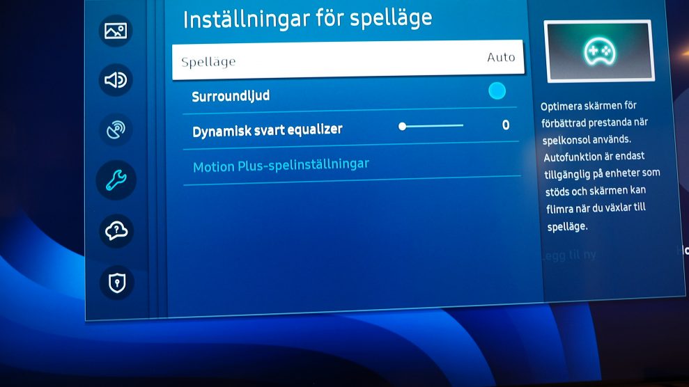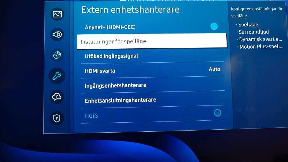 Samsung har också bildinställningarna Dynamisk svart equalizer, som kan användas för att höja detaljnivån i mörka områden (vilket gör det lättare att se fiender gömma sig på mörka ställen, etc). Du kan också välja att aktivera/inaktivera rörelseutjämningen Motion Plus. Den ger mjukare rörelser, men observera att fördröjningen (input lag) då blir lite längre. I menyn för externa enheter hittar du också inställningen HGiG.