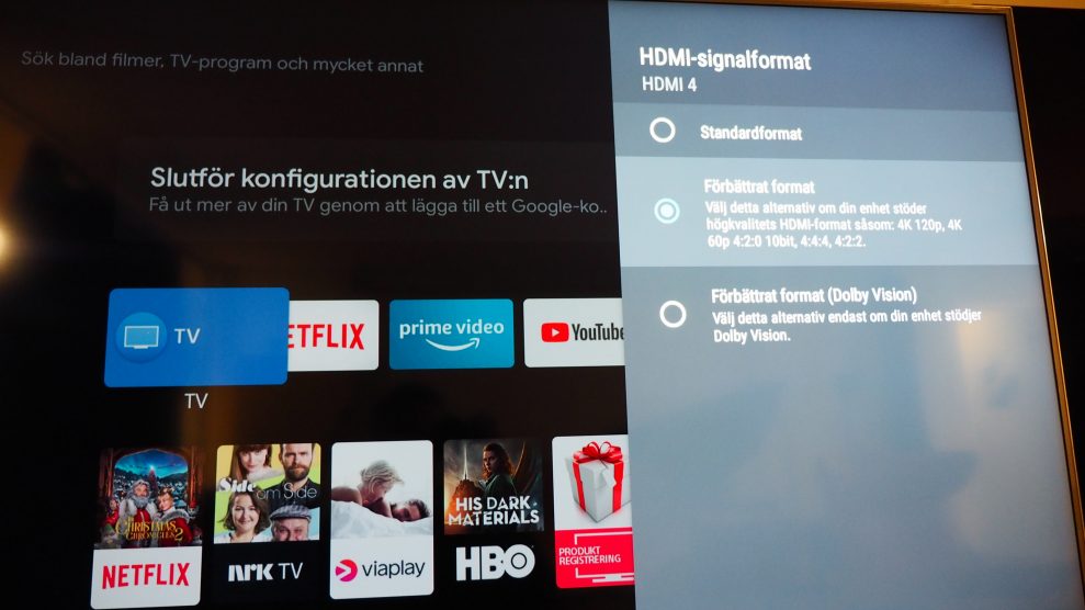 Ange sedan HDMI-signalformat som Förbättrat format. Denna inställning klarar bildlägen upp till 4K/120 Hz. Observera att den här inställningen inte är kompatibel med Dolby Vision.