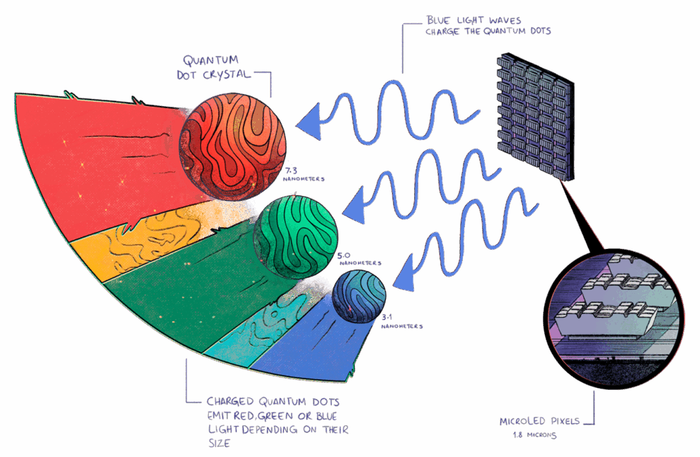 Kvantprickar är pyttesmå nanomaterial som kan ge klarare, rikare och mer precisa färger när de används i en LCD-TV. De introducerades först på high-end-TV-apparater för 10 år sedan och gav ett bredare färgspektrum, särskilt i röda och gröna nyanser, som vi knappt hade sett återgivet tidigare på en konsument-TV.