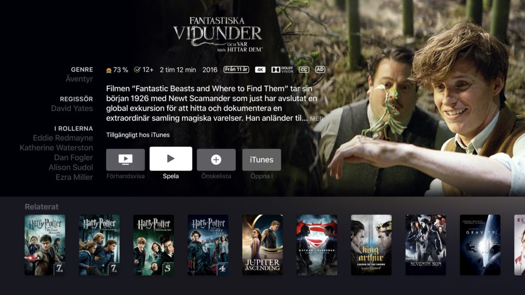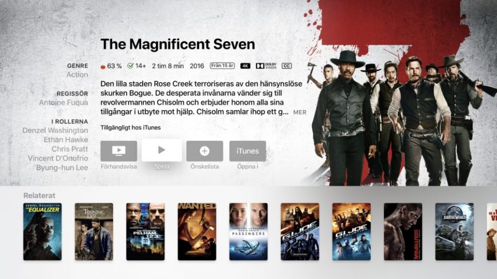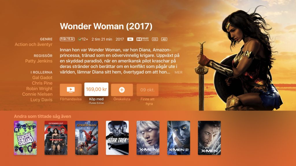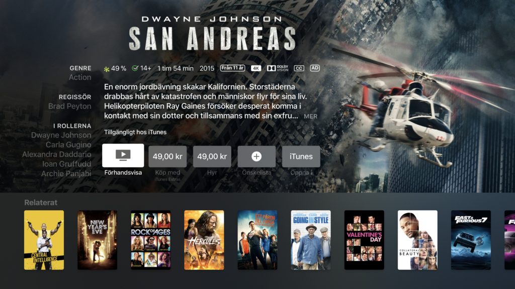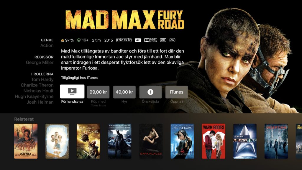 Apple har nämligen skrivit kontrakt med alla de stora filmbolagen, utom Disney, om att göra deras 4K-filmer tillgängliga i iTunes Movies. De första har redan börjat dyka upp, och Apple lovar att om man redan har köpt en film i HD så uppgraderas den gratis till 4K. Nyare filmer kostar typiskt 169 kronor. Dessutom finns Netflix, mestadels egenproducerade, material i 4K om man betalar lite extra. Amazon Prime är också på gång, med aggressivt prissatta filmer.