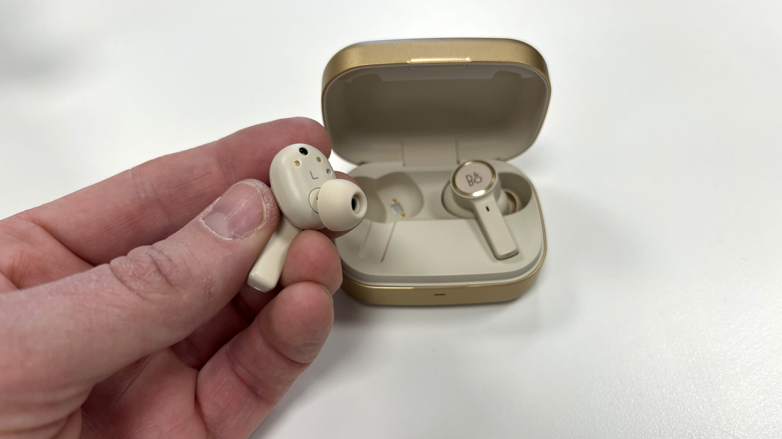 Beoplay EX är däremot de första propparna från Bang & Olufsen som har pinnar för mikrofonerna. Det kan i första hand vara en designdetalj, men flyttar också mikrofonerna närmare munnen. Och är en bättre utgångspunkt för god samtalskvalitet vid samtal och möten.