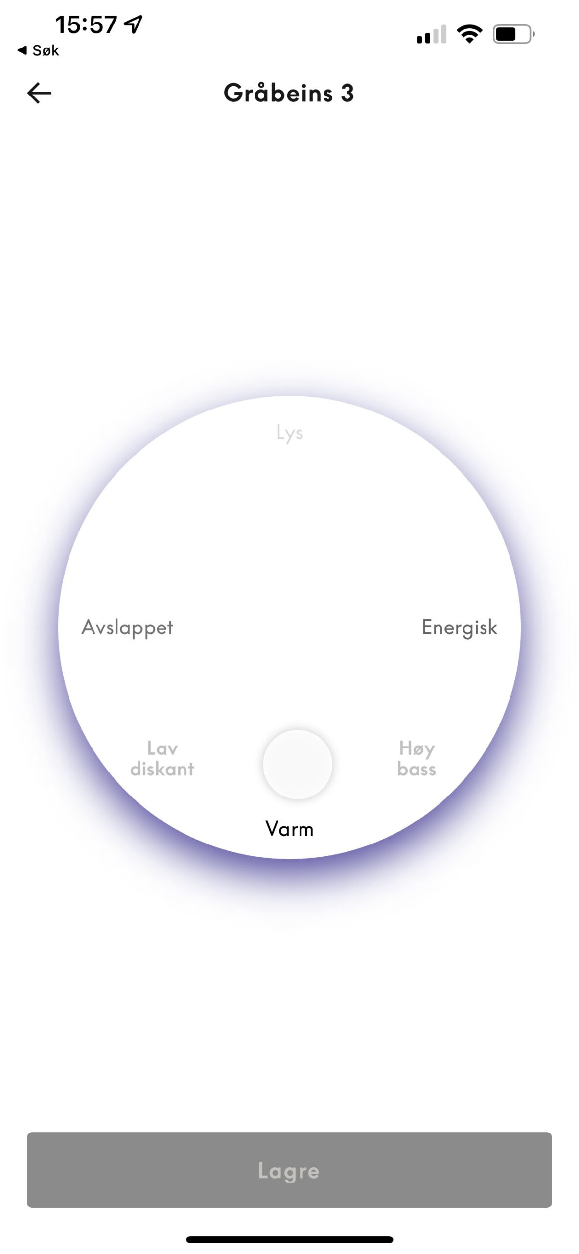 Som tur är kan man justera ljudet själv. Det gör man med en prick som flyttas vart som helst på en cirkulär yta. Den övre delen ger ljust ljud (mindre bas), den nedre är ”varm” (mer bas), den vänstra ”avslappnad” (mindre diskant) och den högra ”energisk” (mer diskant).